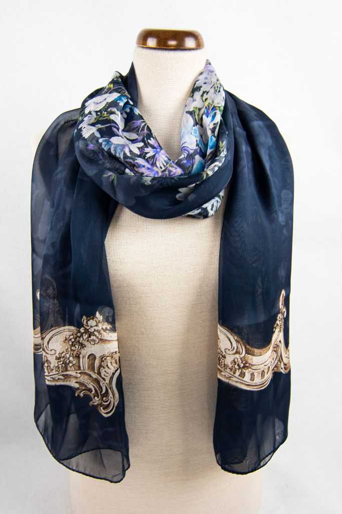 Stola misura 200 x 70 cm. Composizione 100% seta . Stola fantasia realizzata in Italia, colore di fondo blu con fantasia floreale centrale. Ai lati la stola ha un motivo a cornice barocca. Un bouquet di fiori dai colori delicati nei toni del violetto, bluette e bianco.