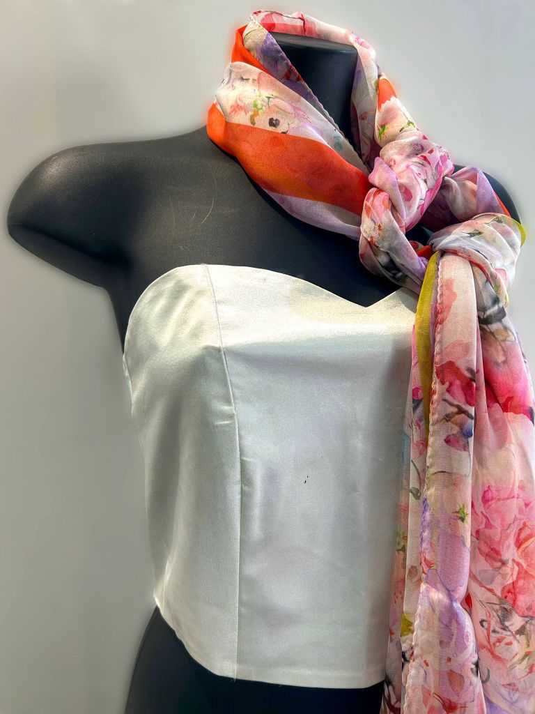 Stola misura 200 x 70 cm. Composizione 100% seta . Stola fantasia realizzata in Italia, un bouquet di fiori dai colori delicati nei toni del rosa si estendono su tutta la superficie. Fiori con colori tenui e delicati chiusi in una bordatura color arancio. Un tripudio di fiori che rendono questa stola una meraviglia per gli occhi e un piacere da indossare per ravvivare qualsiasi outfit.