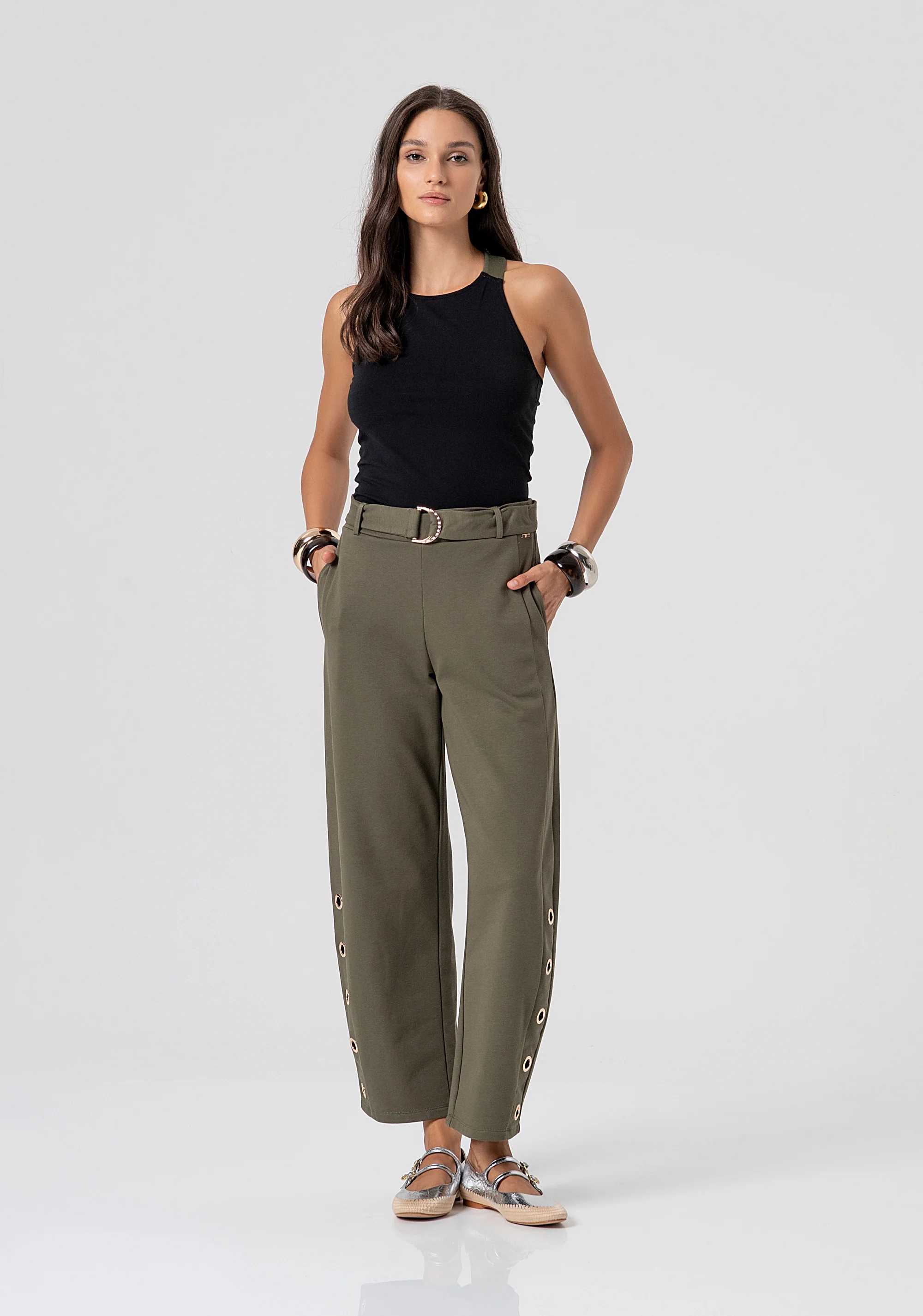 Pantalone carrot balloon fit in felpa con occhielli vela applicati, vita regolare con fusciacca, e con tasche laterali.
