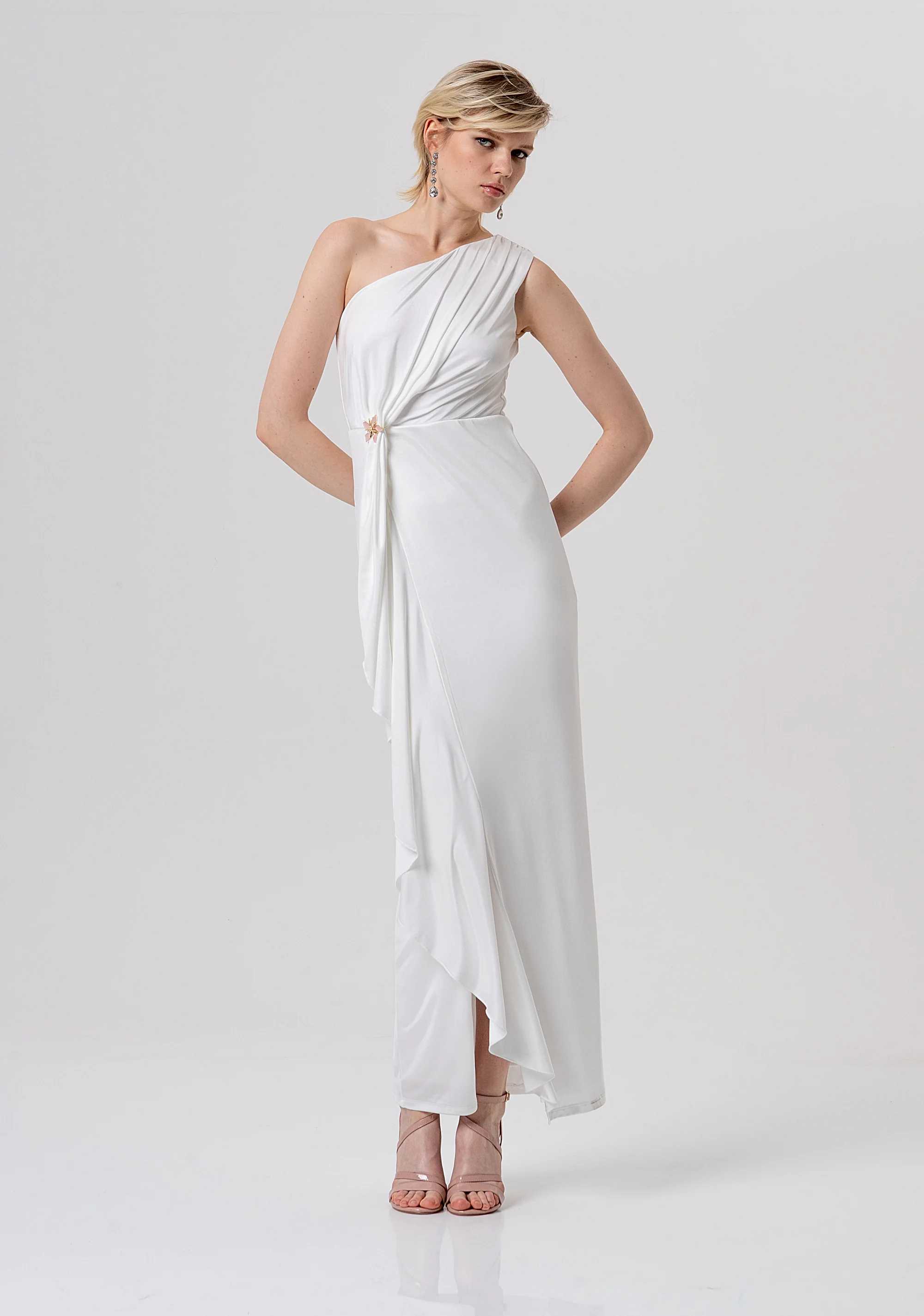 Abito slim lungo monospalla, arriccio laterale, e con spacco sul davanti.