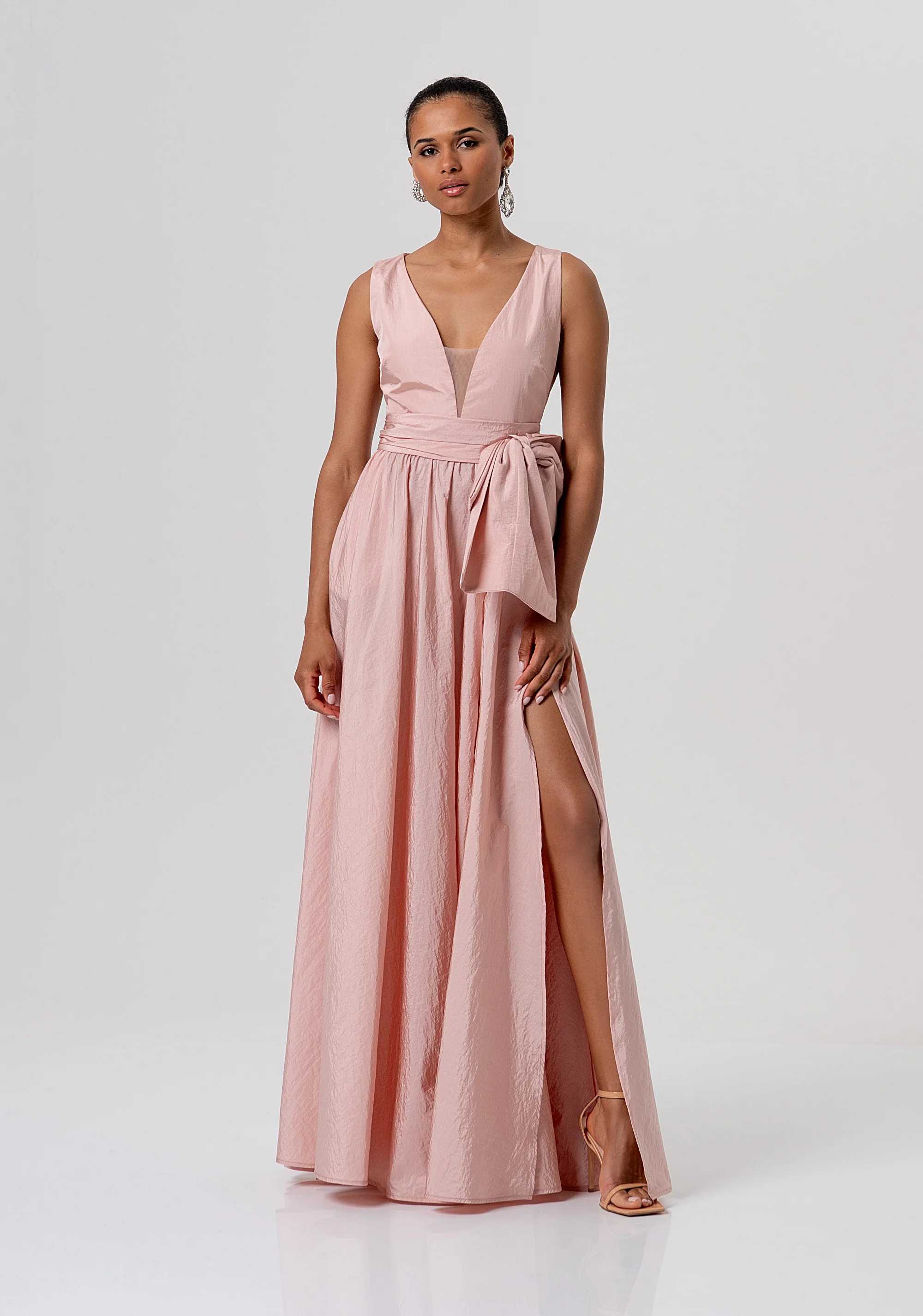 Abito senza maniche lungo in taffetà, scollo a V, zip sul dietro per apertura, fiocco in vita, e con gonna ampia con spacco sul davanti.