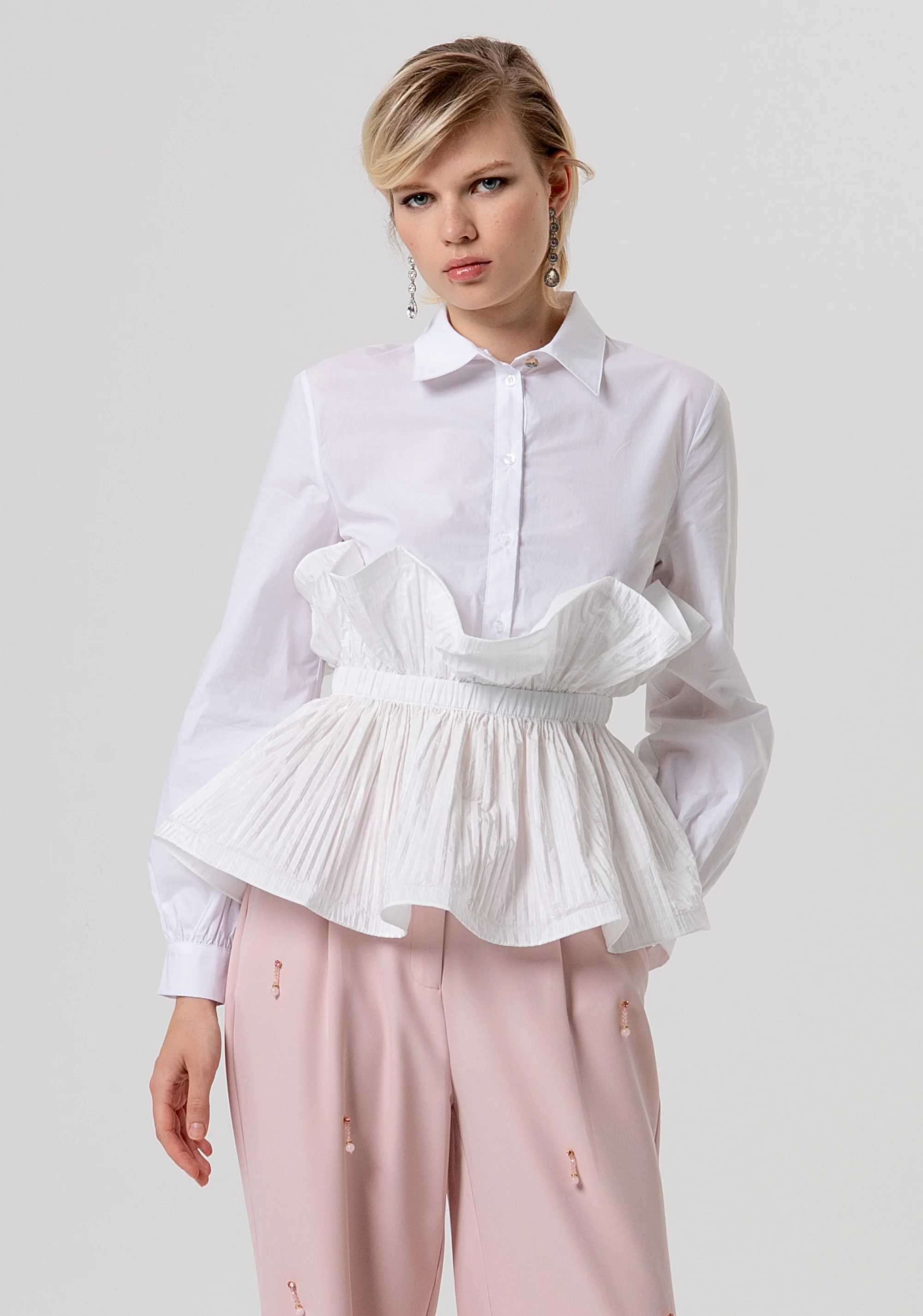 Camicia regular in popeline con gale plissettate, colletto classico, bottoni centrali per apertura, e con maniche lunghe.
