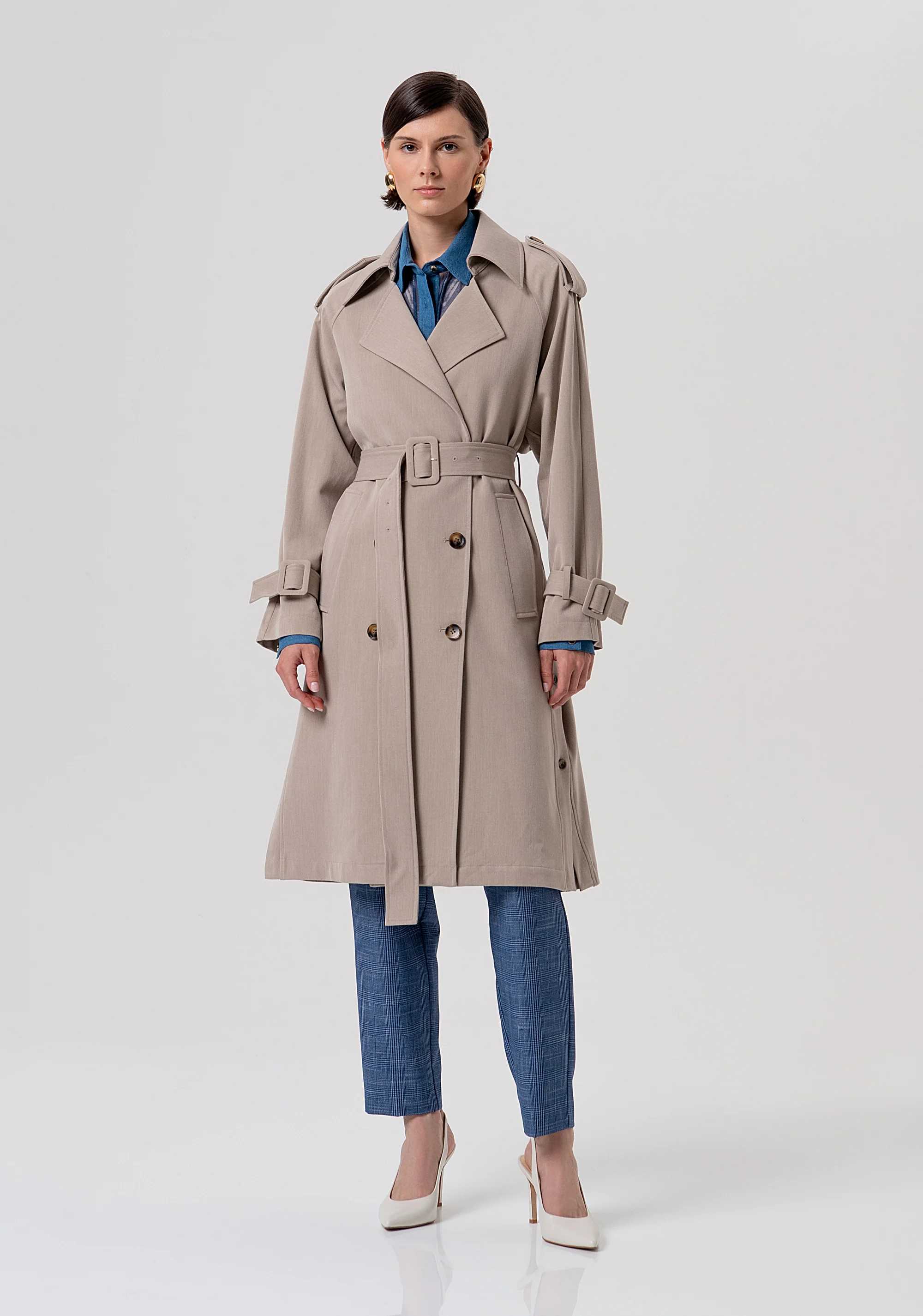 Giacca regular modello trench lungo, colletto classico, doppiopetto, cintura in vita, tasche laterali, e con maniche lunghe.