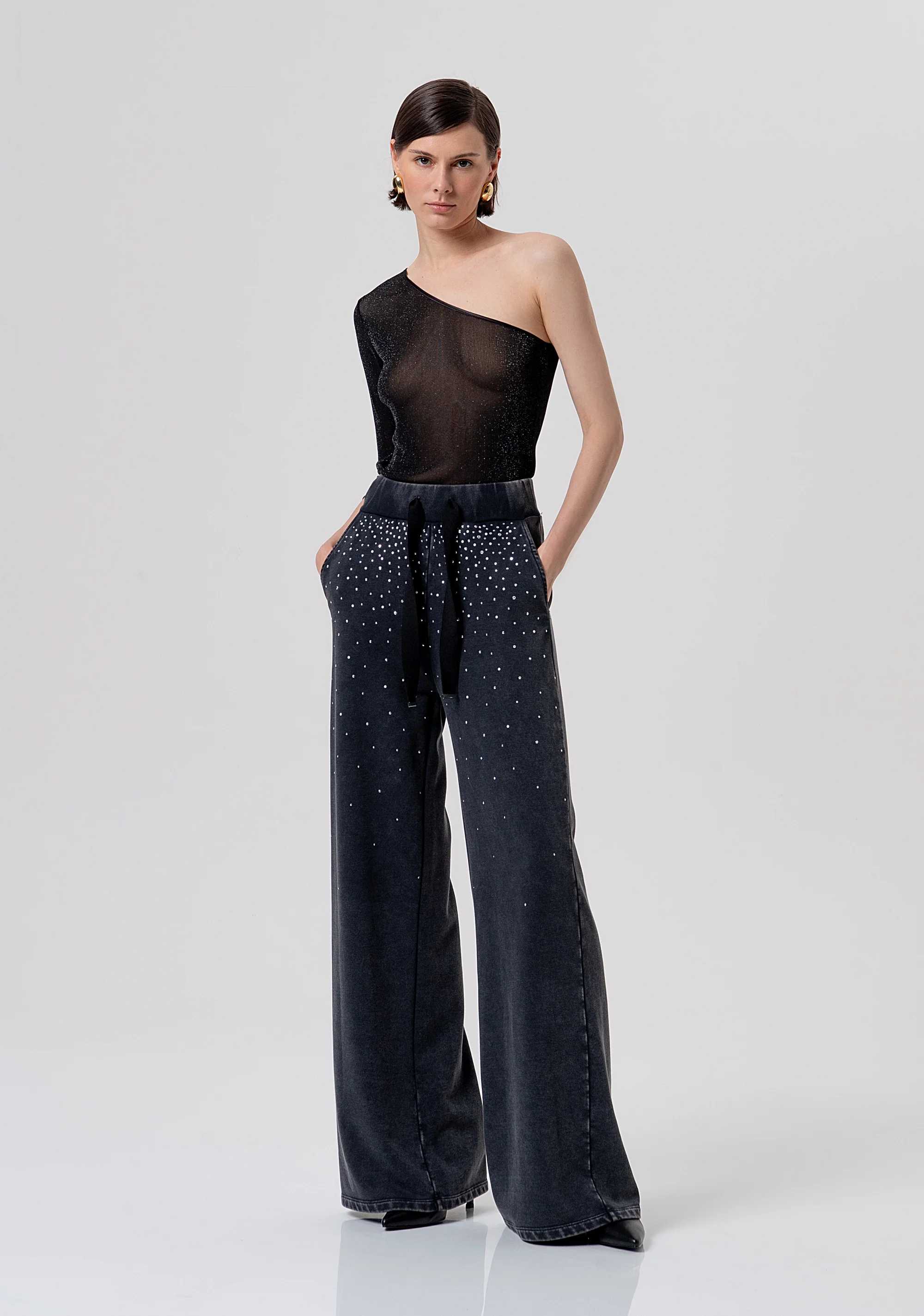 Pantalone flare a palazzo in felpa con lavaggio used, strass applicati, vita alta, tasche alla francese davanti, e con fondo ampio.