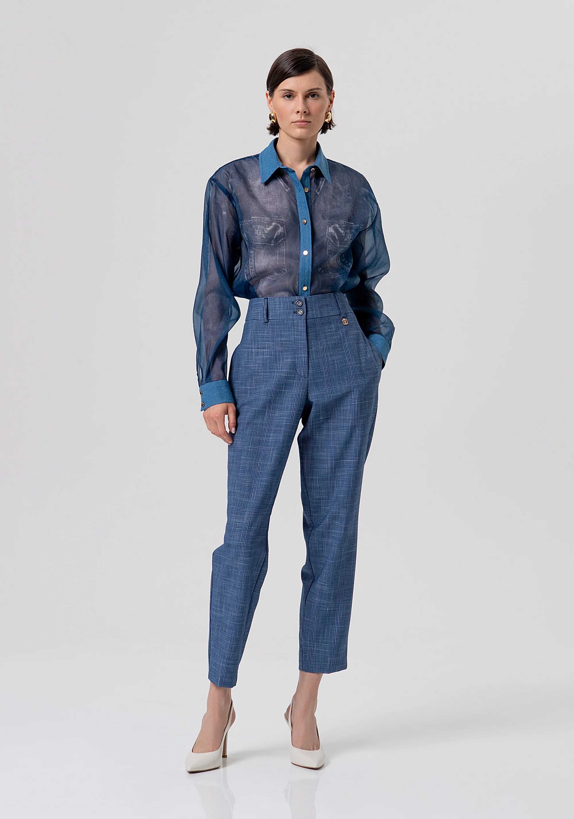 Pantalone carrot modello chino in Principe di Galles, vita regolare, tasche alla francese davanti, e con fondo dritto.
