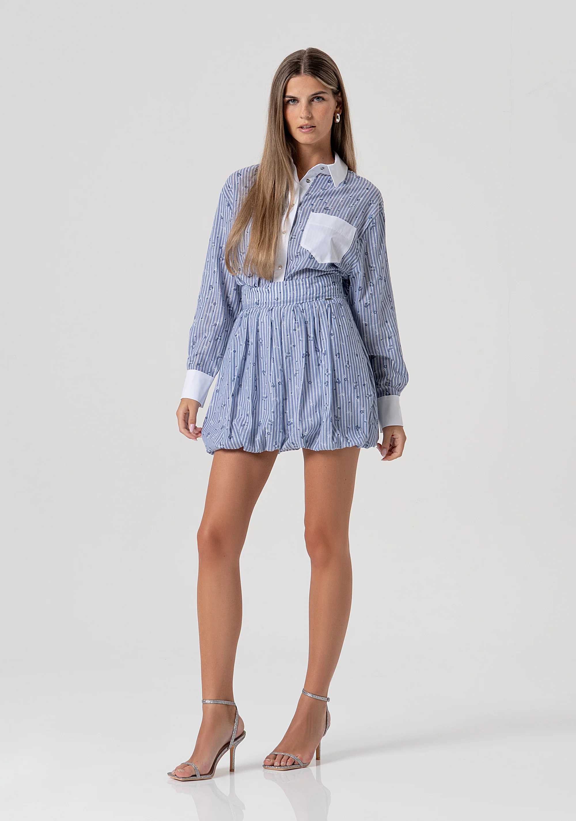 Gonna flare balloon fit in popeline a righe e fiori, e con vita regolare.