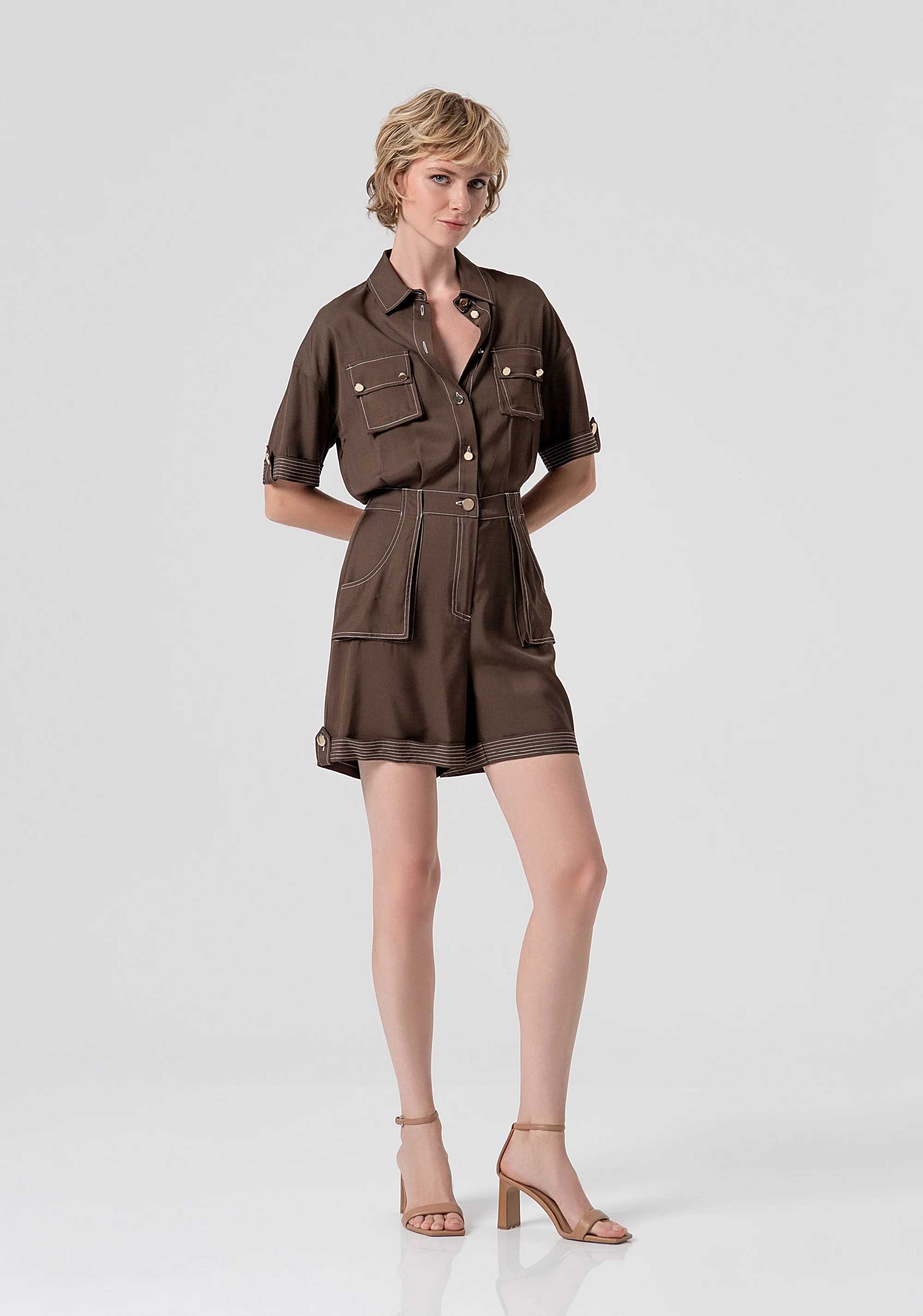 Tuta regular corta, colletto classico, bottoni centrali per apertura, tasche applicate, con pantaloncini corti con fondo ampio.