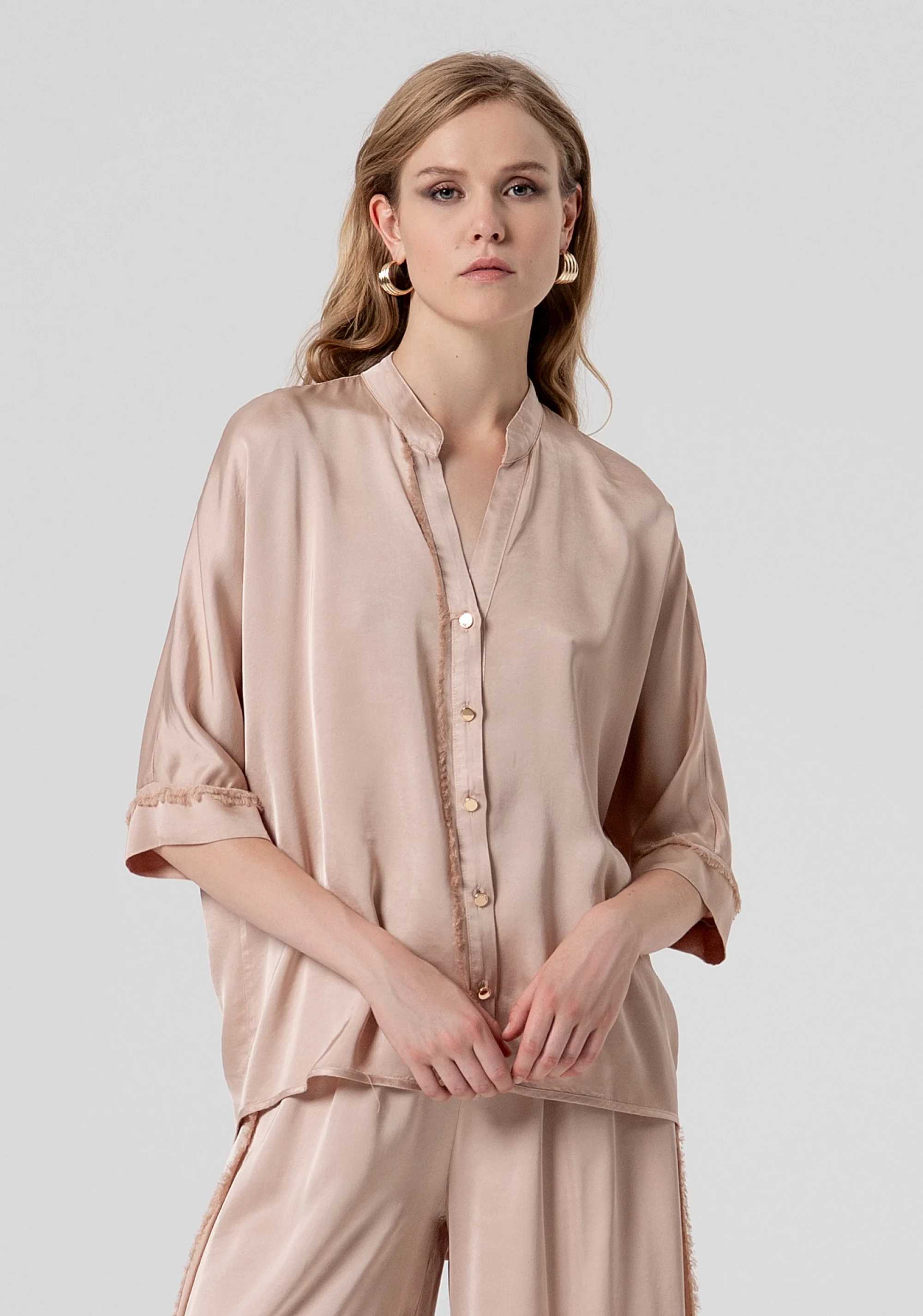 Camicia over in raso di viscosa, colletto alla coreana, bottoni centrali per apertura, e con maniche a 3/4.