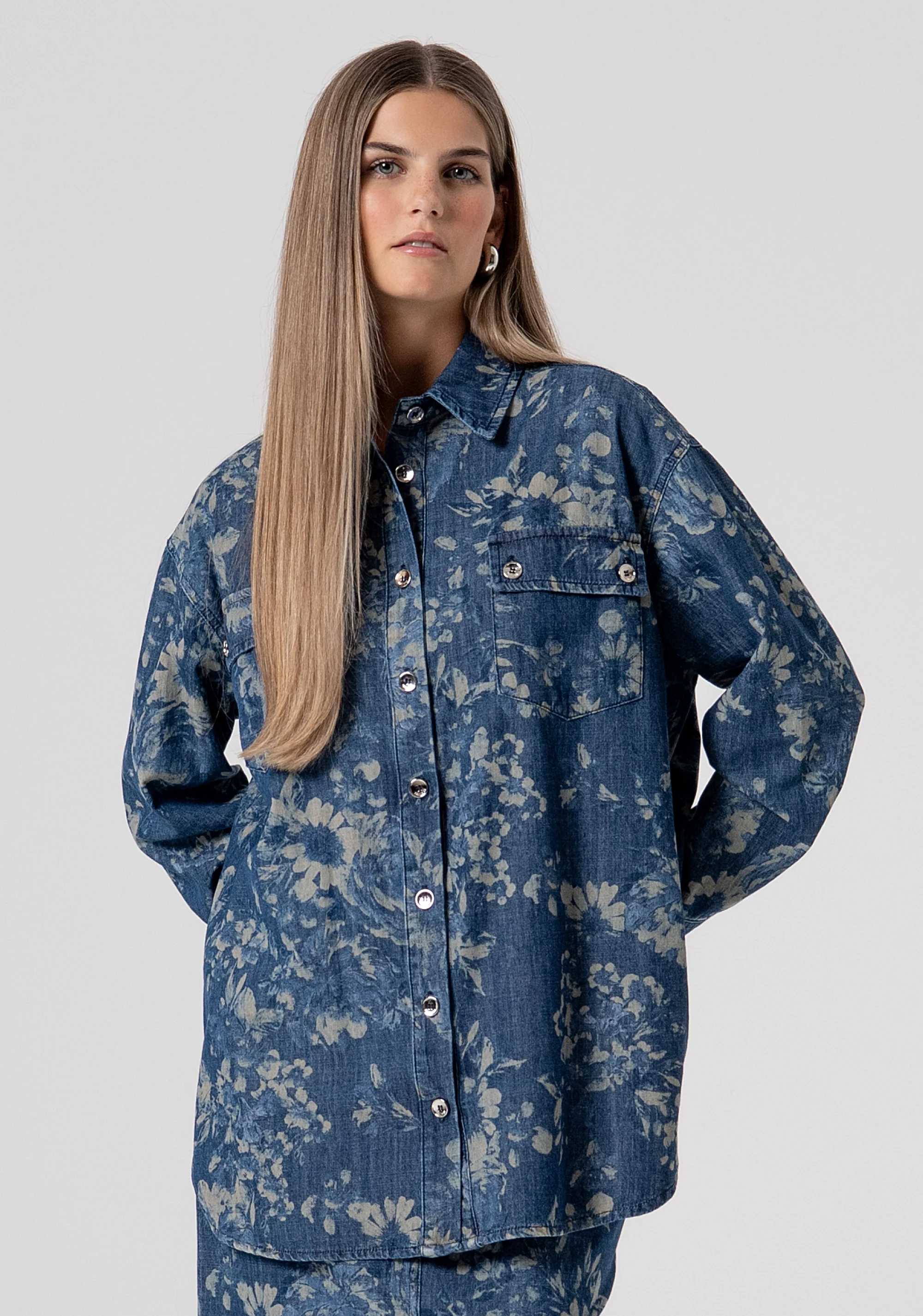 Camicia regular in denim con fantasia floreale, colletto classico, bottoni centrali per apertura, tasche applicate, e con maniche lunghe.