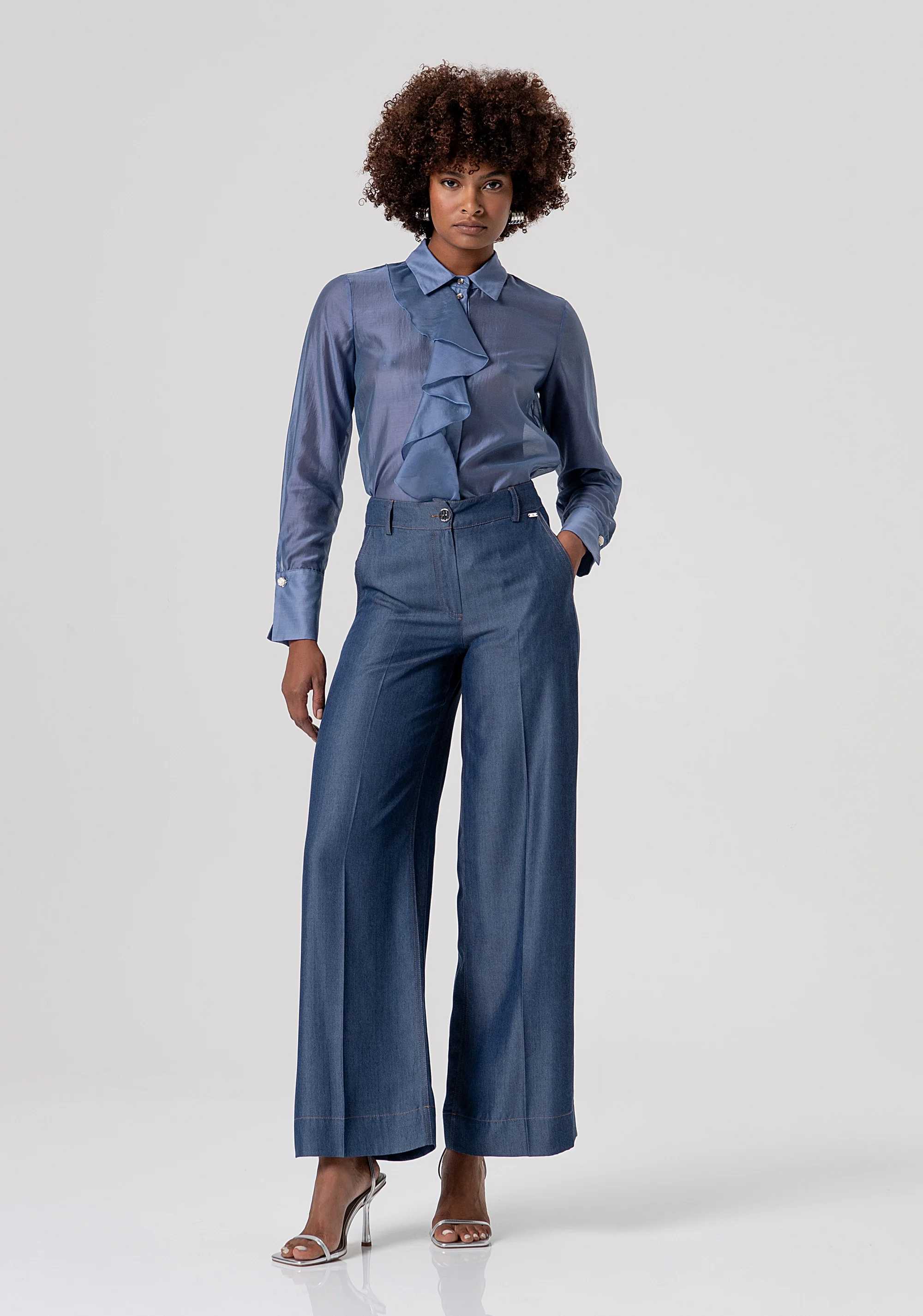 Pantalone flare a palazzo in chambray, vita alta, tasche alla francese sul davanti, e con fondo ampio.