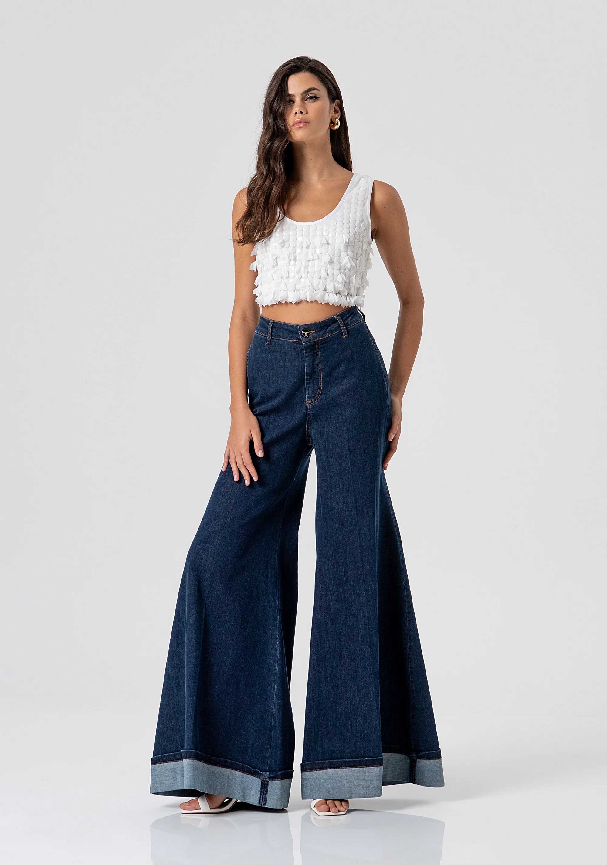 Jeans flare a palazzo in denim con lavaggio scuro, vita alta, tasche sui fianchi, filetto sul dietro, e con fondo ampio con risvolto alto.