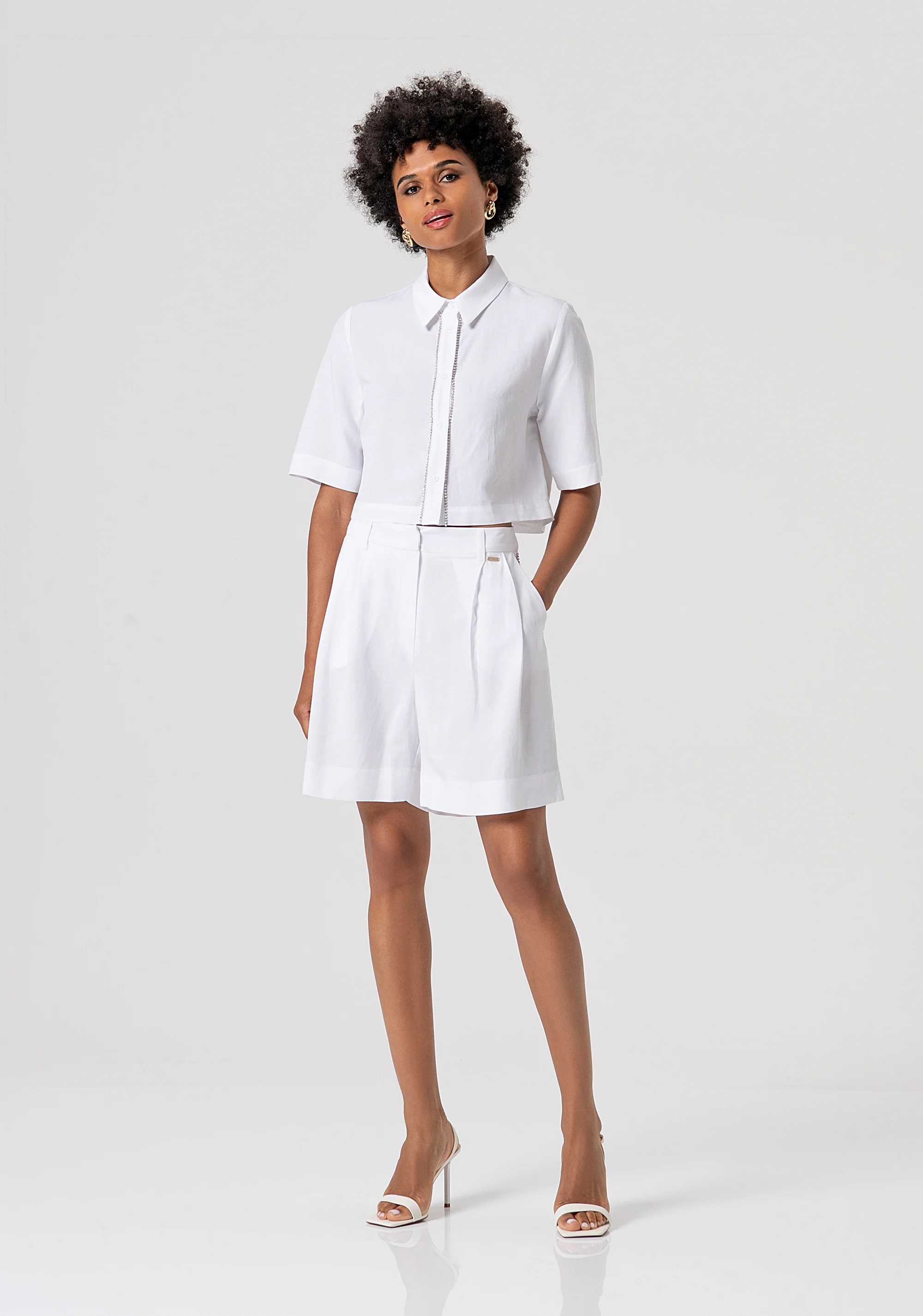 Pantaloncini regular con lino, vita regolare, pences, tasche alla francese sul davanti, tasche a filetto sul dietro, e con fondo ampio.