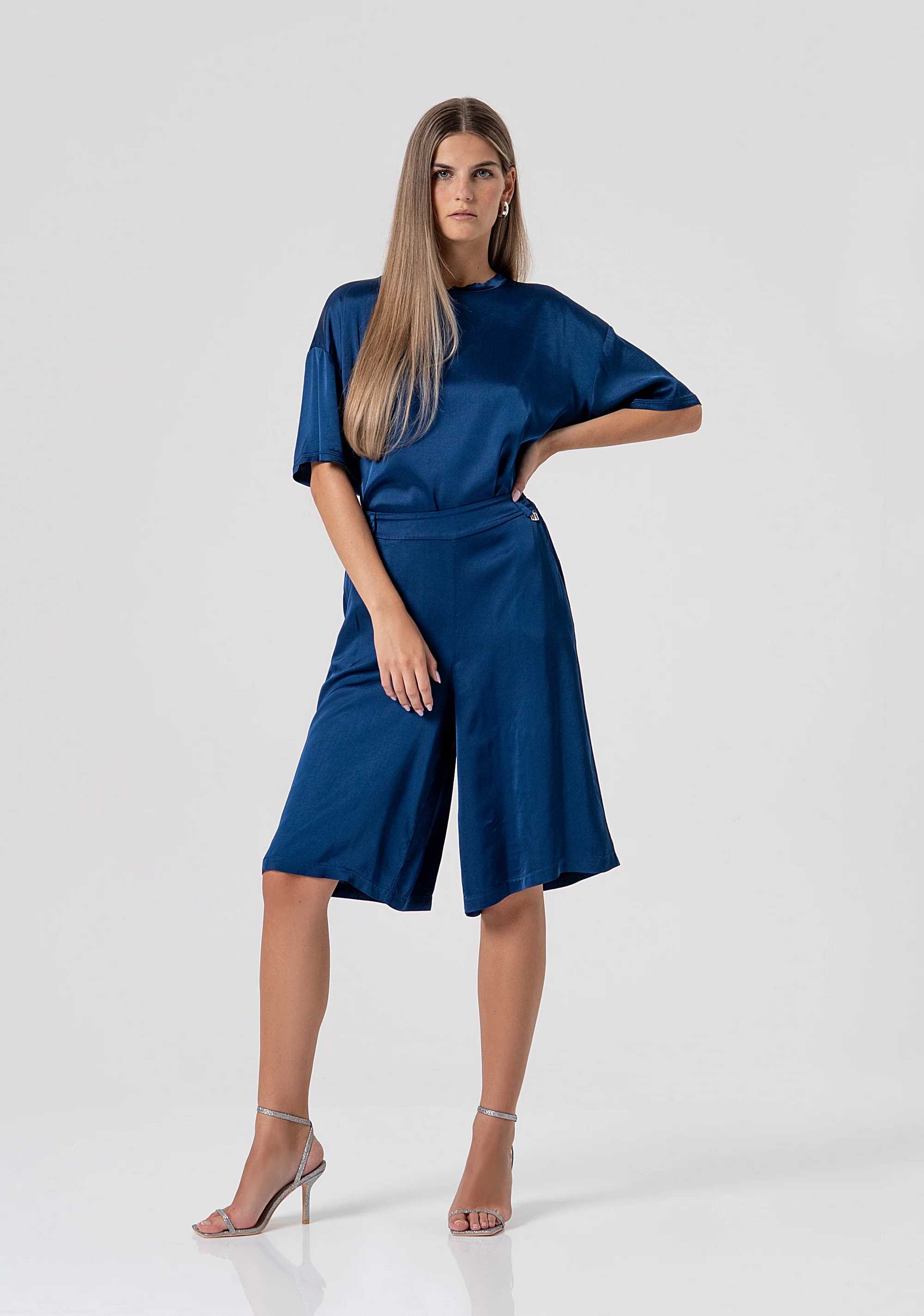 Bermuda flare in raso di viscosa, vita alta con elastico sul dietro, tasche alla francese sul davanti, e con fondo ampio.