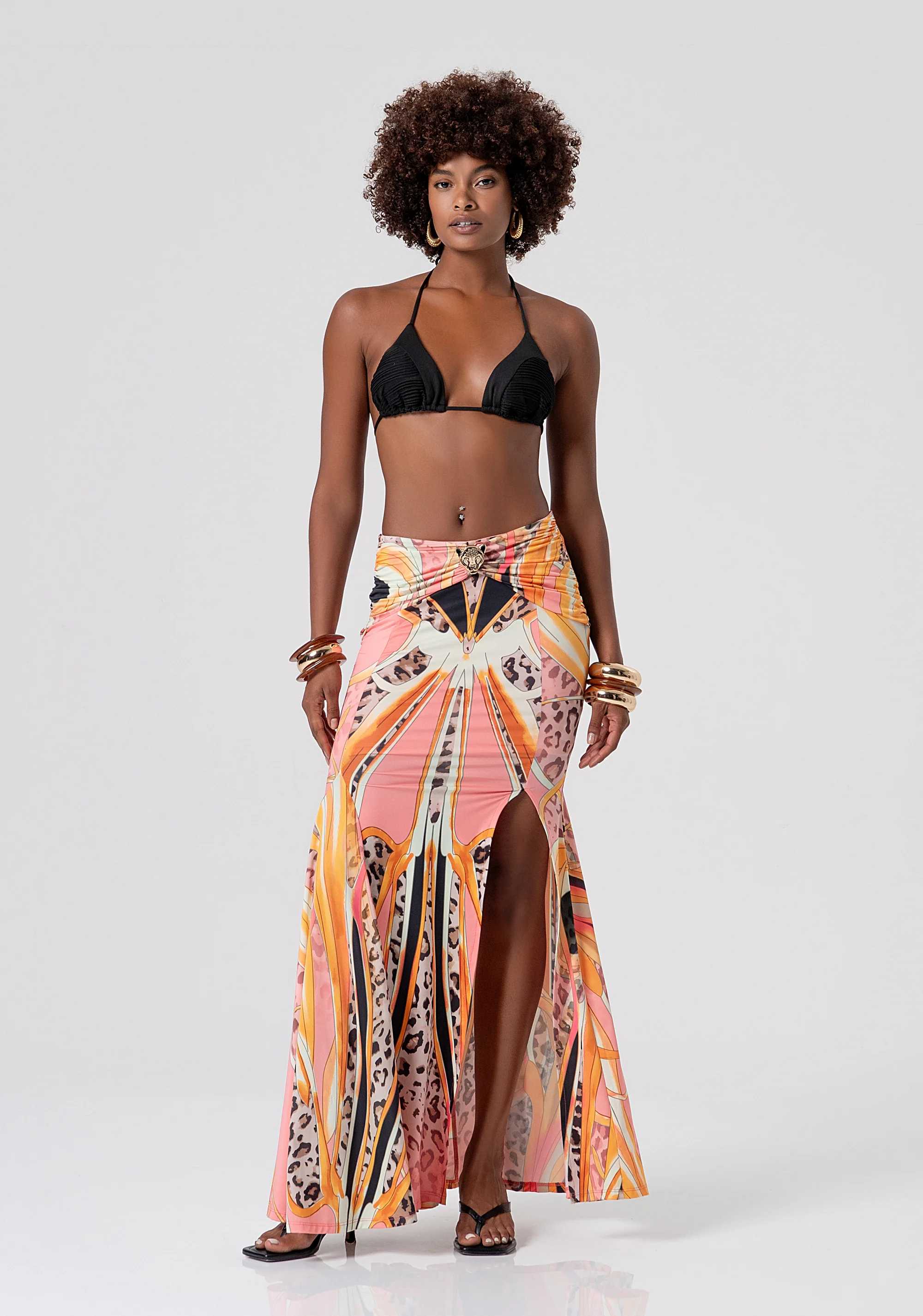 Gonna slim lunga in fantasia, vita regolare con accessorio metallico, e con spacco sul davanti.