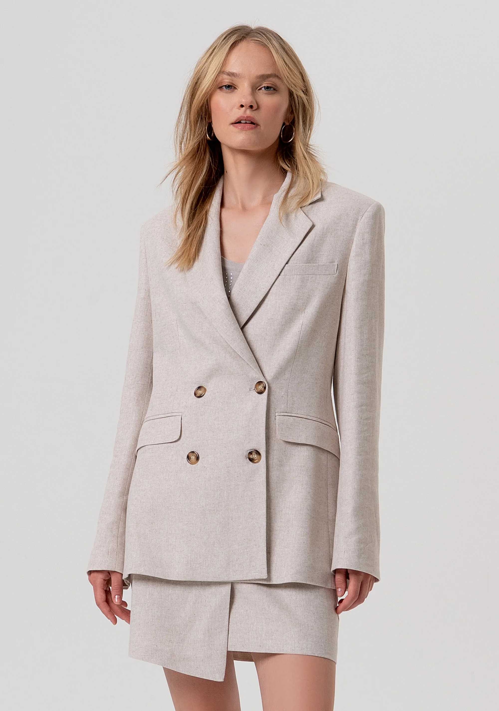 Blazer regular doppiopetto con lino, revers classico, bottoni per apertura, pattine, e con maniche lunghe.