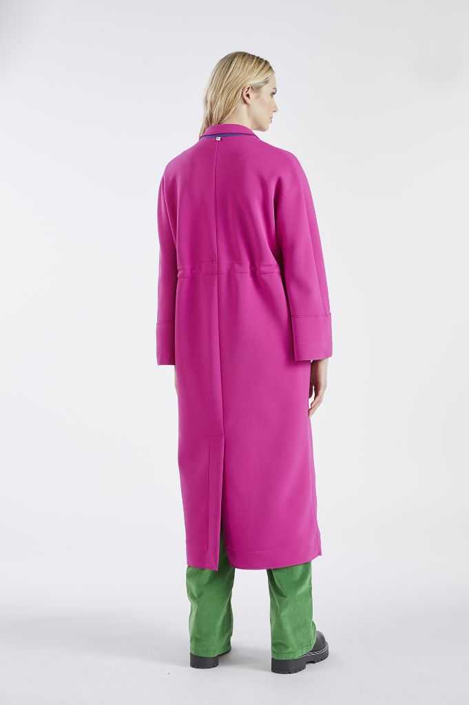 Cappotto oversize in tessuto tecnico accoppiato con interno a contrasto colore e rifiniture a taglio vivo