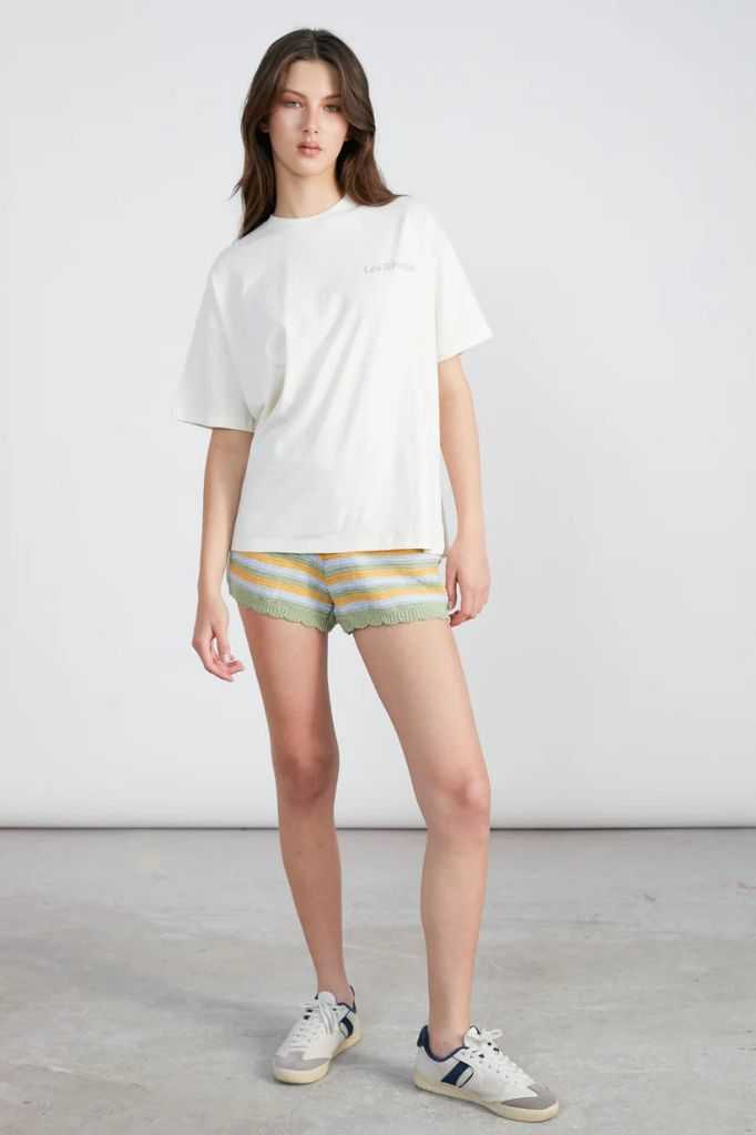 Questi pantaloni corti all'uncinetto sono perfetti per l'estate con il loro design unico a strisce verdi e comodi polsini elastici.
