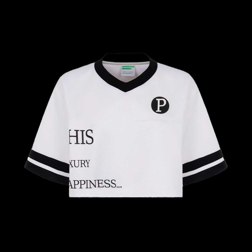 Un omaggio allo stile sportivo con un tocco di lusso: la t-shirt bianca in triacetato 100% Made in Italy è l’ideale per chi cerca un look fresco e dinamico. Lo scollo a V e le due strisce nere sulle maniche donano un twist NBA al design, arricchito dall’accessorio nero con la “P” bianca e dalla stampa esclusiva “This is Luxury and Happiness…”. Perfetta per chi non ha paura di mixare comfort e stile.