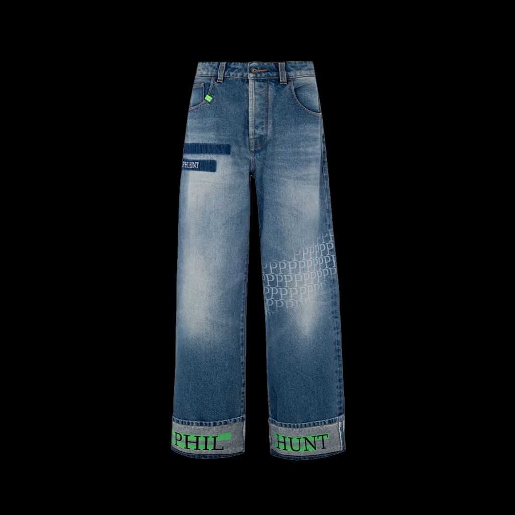 Un’icona reinventata con un twist moderno. Questi jeans oversize in denim blu, 100% Made in Italy, esaltano la qualità artigianale con dettagli audaci. Il logo stampato sul retro e la pioggia di piccole “P” lungo la gamba aggiungono profondità grafica, mentre il doppio risvolto con la stampa verde “PHIL HUNT” dona un accento di carattere. Perfetti per chi ama giocare con i contrasti tra classico e contemporaneo.