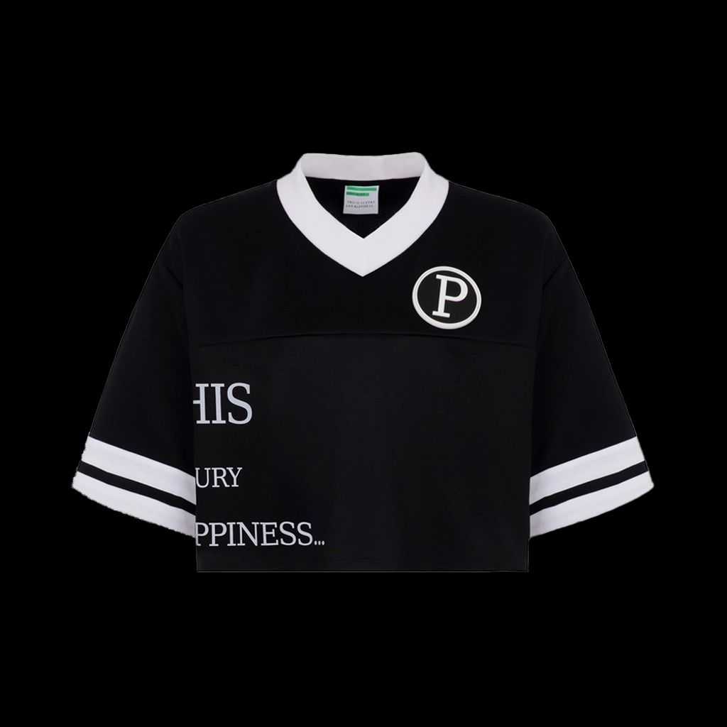 Street style e lusso si fondono in un unico capo: la t-shirt nera in triacetato 100% Made in Italy è un must-have per le fashioniste moderne. Con il suo scollo a V, le strisce bianche sulle maniche e il colletto in contrasto, questa t-shirt si distingue per il suo spirito NBA. L’accessorio nero con la “P” bianca e la stampa “This is Luxury and Happiness…” la rendono perfetta per chi ama esprimere la propria personalità con eleganza e audacia.