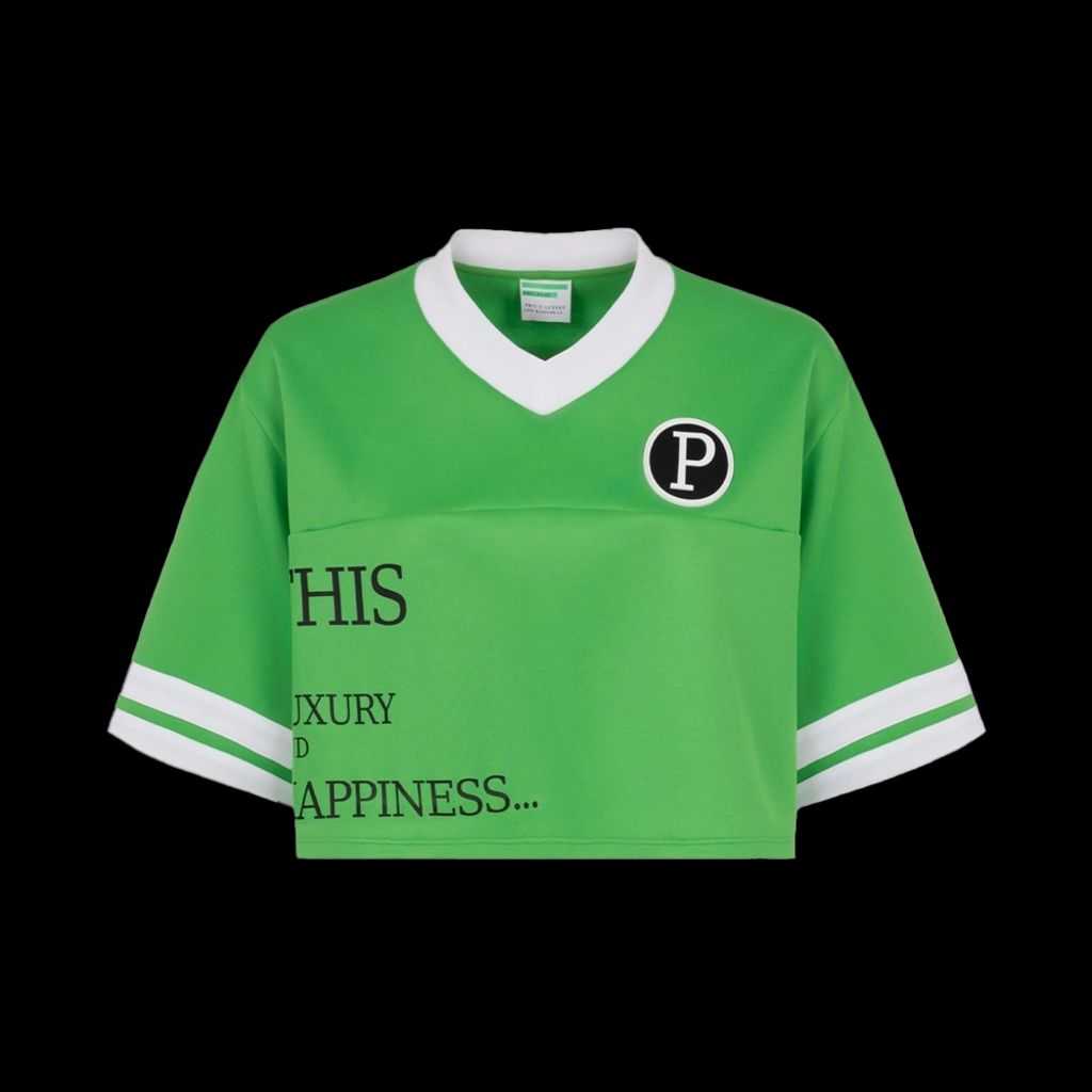 La t-shirt verde in triacetato 100% Made in Italy è un capo che unisce lo sportivo al lussuoso in modo impeccabile. Lo scollo a V e le strisce bianche sulle maniche catturano l’attenzione, mentre il colletto in contrasto aggiunge un tocco distintivo. Arricchita con l’accessorio nero con la “P” bianca e la stampa “This is Luxury and Happiness…”, è il capo perfetto per chi vuole un look fresco, energico e decisamente esclusivo.