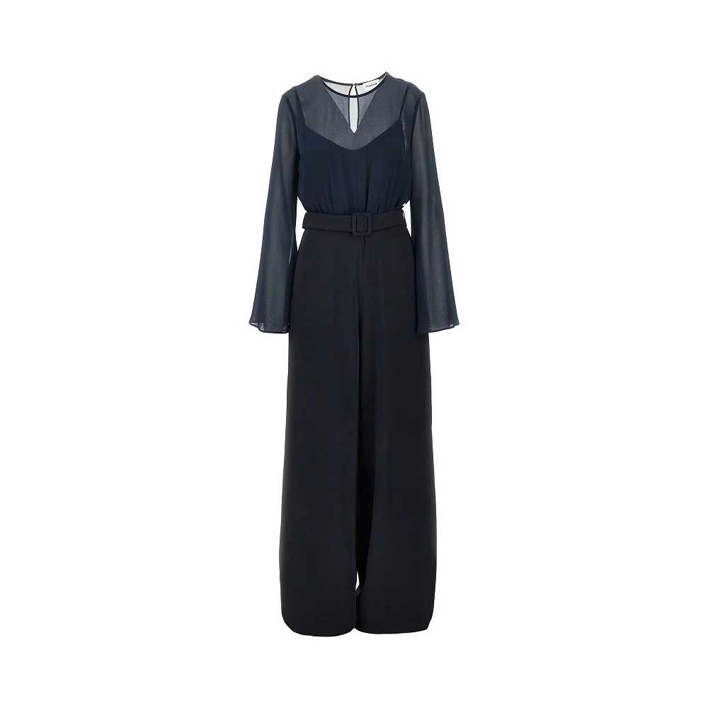 Jumpsuit caratterizzata dal pantalone palazzo a vita alta in fluido cady e dalla blusa a manica lunga in leggero chiffon, accessoriata di cintura abbinata rimovibile. Girocollo. Apertura sulla schiena con bottoncino sul retro del collo. Tasche inserite nelle cuciture laterali. Chiusura zip sul retro