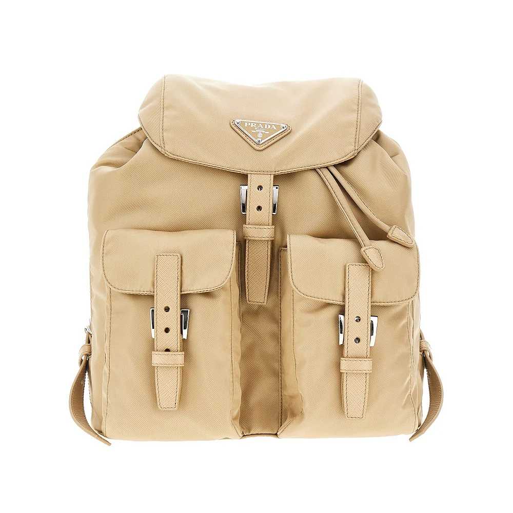 Zaino realizzato in nylon rigenerato Re-Nylon con dettagli in pelle Saffiano. Maniglia e spallacci regolabili in nastro. Tasche frontali e patta con fibbia. Logo triangolo in metallo smaltato sulla patta. Chiusura con coulisse. Fodera in nylon logato e due tasche interne, di cui una con zip.
