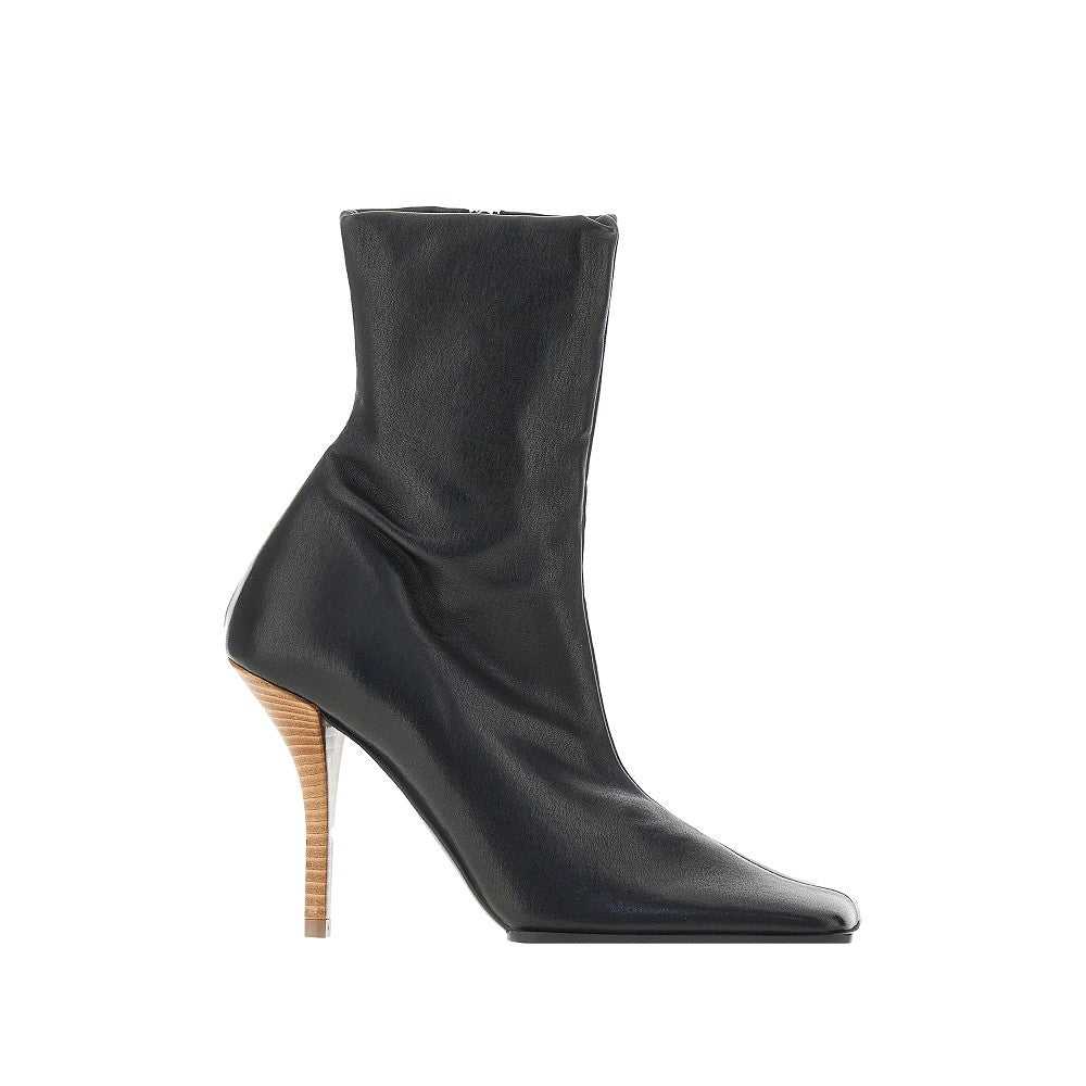 Stivaletti alla caviglia dalla tomaia a calzino in morbida pelle, caratterizzati dalla punta squadrata. Chiusura laterale con zip. Fodera e plantare in pelle. Tacco in cuoio lamellato a contrasto con finitura lucida. Suola in cuoio con intarsio in gomma.