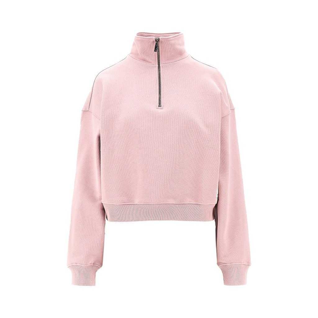 Felpa realizzata in french terry di cotone biologico, caratterizzata dal collo alto e dalla chiusura con zip parziale. Polsini e fondo capo lavorati a costine. Etichetta logo in tessuto applicata lateralmente sul fondo. Vestibilità larga e rilassata con spalle scese.