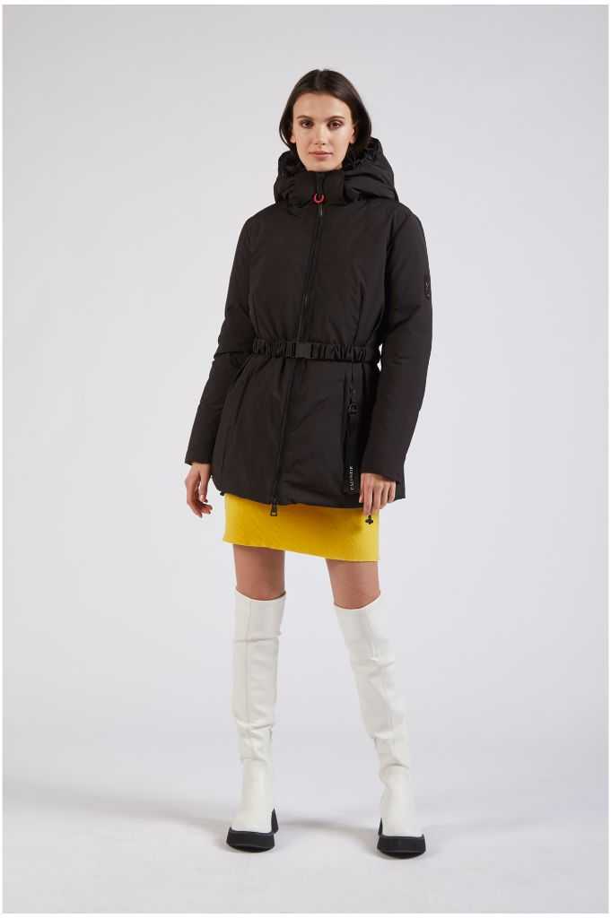 Piumino imbottito dal tessuto opaco e dal gusto tecafènoirico. la cintura segna il punto vita.