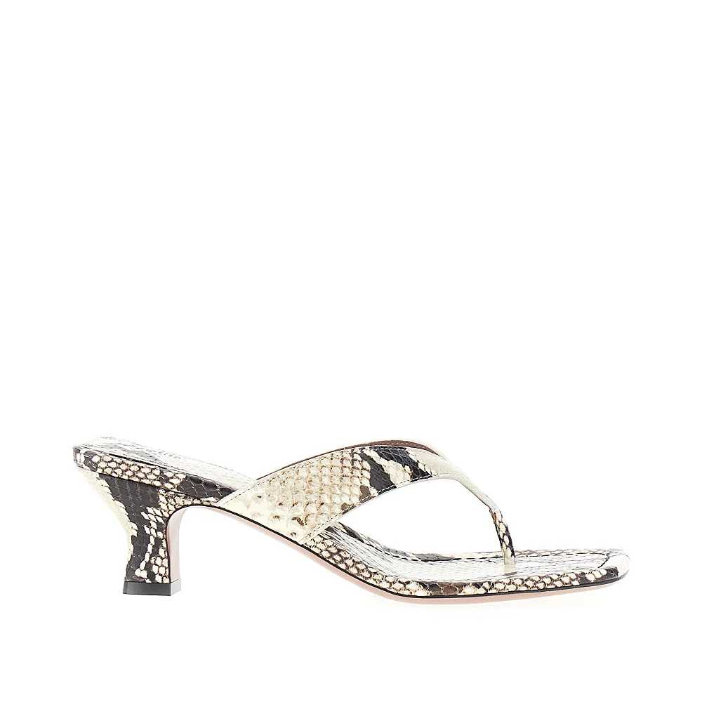 Mules infradito realizzate in pelle stampa pitone, caratterizzate dal tacco a rocchetto rivestito in pelle. Fodera e plantare in pelle. Suola in cuoio.