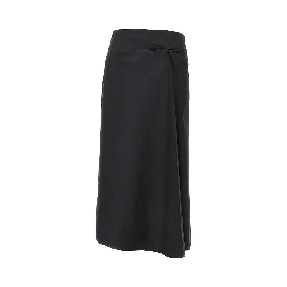 Gonna midi realizzata in raso di misto cotone elasticizzato, caratterizzata dalla lavorazione drappeggiata sul fianco sinistro. Chiusura con zip a scomparsa sul retro. Silhouette dritta e regolare. Sfoderata.