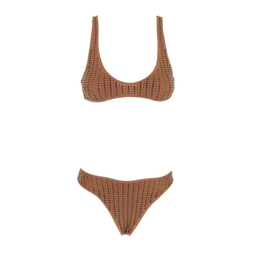 Bikini realizzato in morbido Lycra, arricchito da strass tono su tono applicati all-over. Top a brasserie e slip braziliana sgambato. Foderato.
