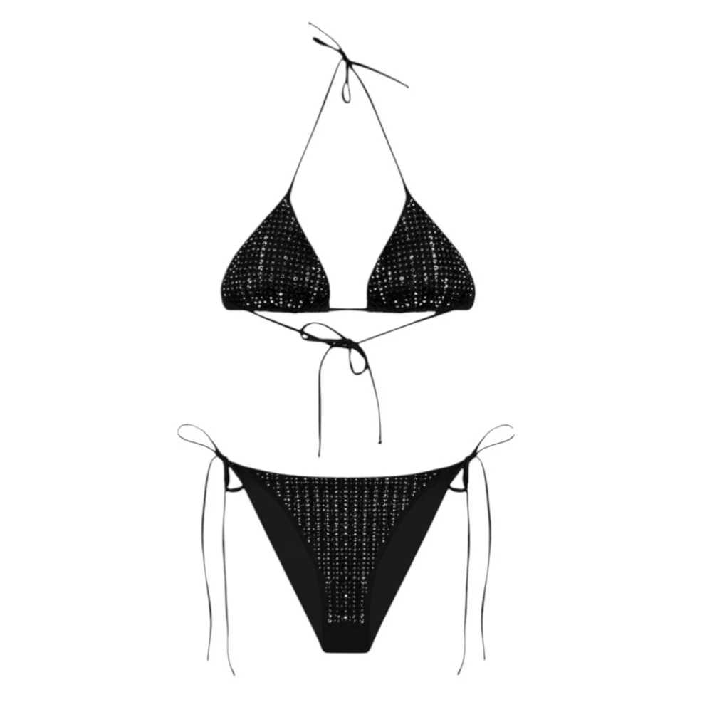 Bikini realizzato in tessuto tecnico elasticizzato, arricchito dagli strass tono su tono applicati all-over. Top con coppette rimovibili, laccetti da annodare al collo e sul retro. Slip con laccetti da annodare ai fianchi. Foderato.