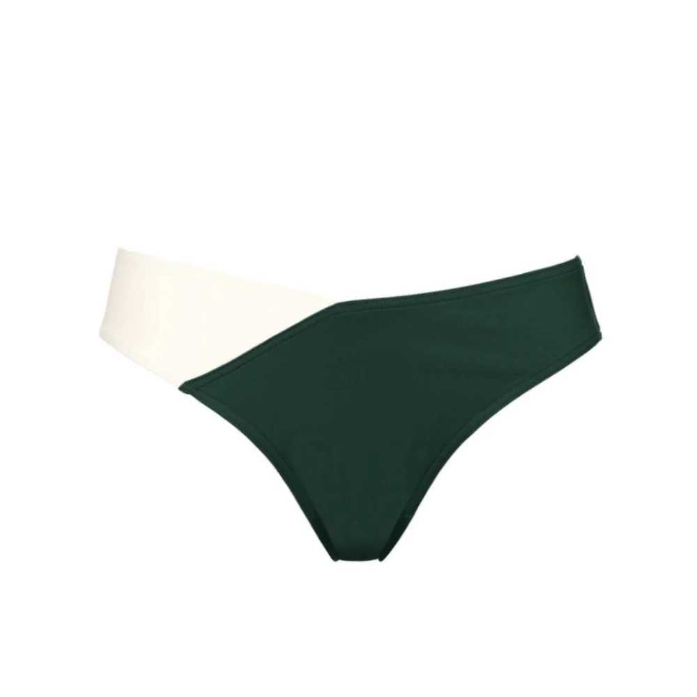 Slip bikini bicolore realizzato in tessuto tecnico elasticizzato prodotto con poliammide di origine vegetale. Vita con taglio a V e silhouette sgambata.