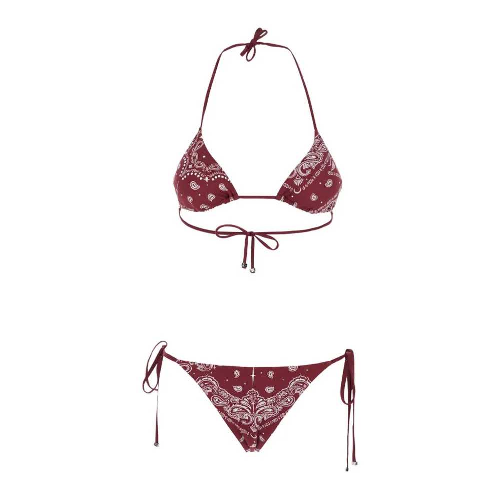 Bikini due pezzi realizzato in morbido e leggero microfibra elasticizzato con motivo Bandana all-over, arricchito da strass. Top a triangolo con coppe scorrevoli, imbottitura rimovibile e chiusura con laccetti da annodare sul collo e sulla schiena. Slip con laccetti da annodare sui fianchi. Foderato