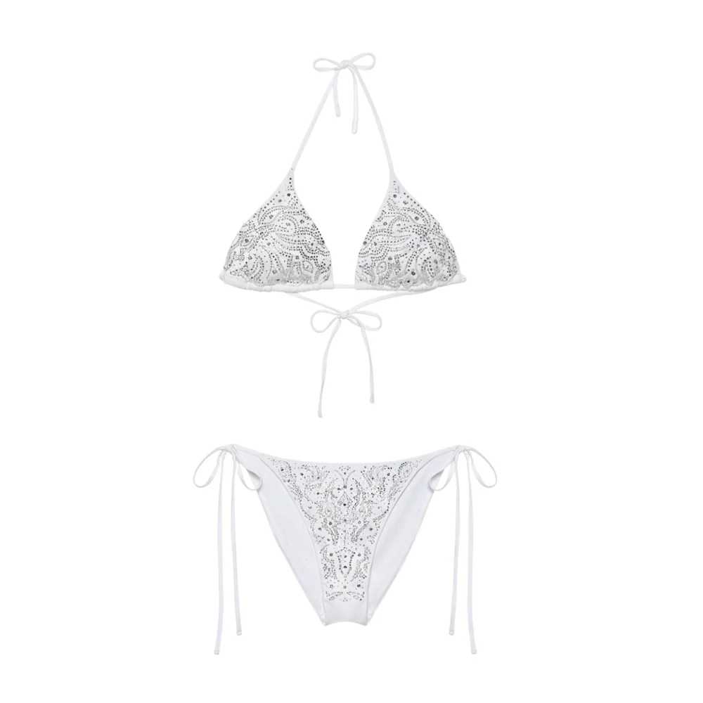 Bikini realizzato in tessuto tecnico elasticizzato, arricchito dagli strass di varie forme e dimensioni applicati all-over. Top con coppette rimovibili, laccetti da annodare al collo e sul retro. Slip con laccetti da annodare ai fianchi. Foderato.