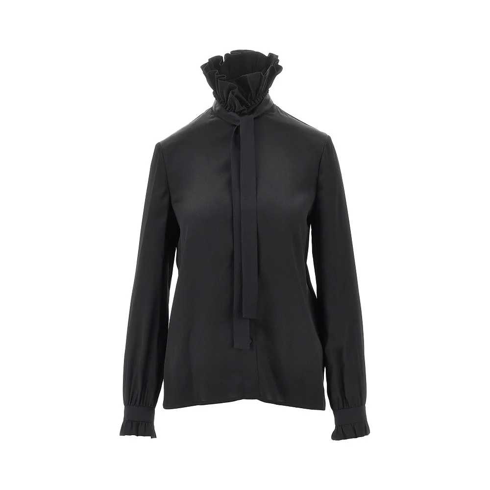 Camicia realizzata in leggero e morbido raso di pura seta, caratterizzata dal colletto rialzato e arricciato con fiocco annodato rimovibile. Chiusura con bottoncini rivestiti in raso. Polsini con ruche e bottoncino. Vestibilità regolare.