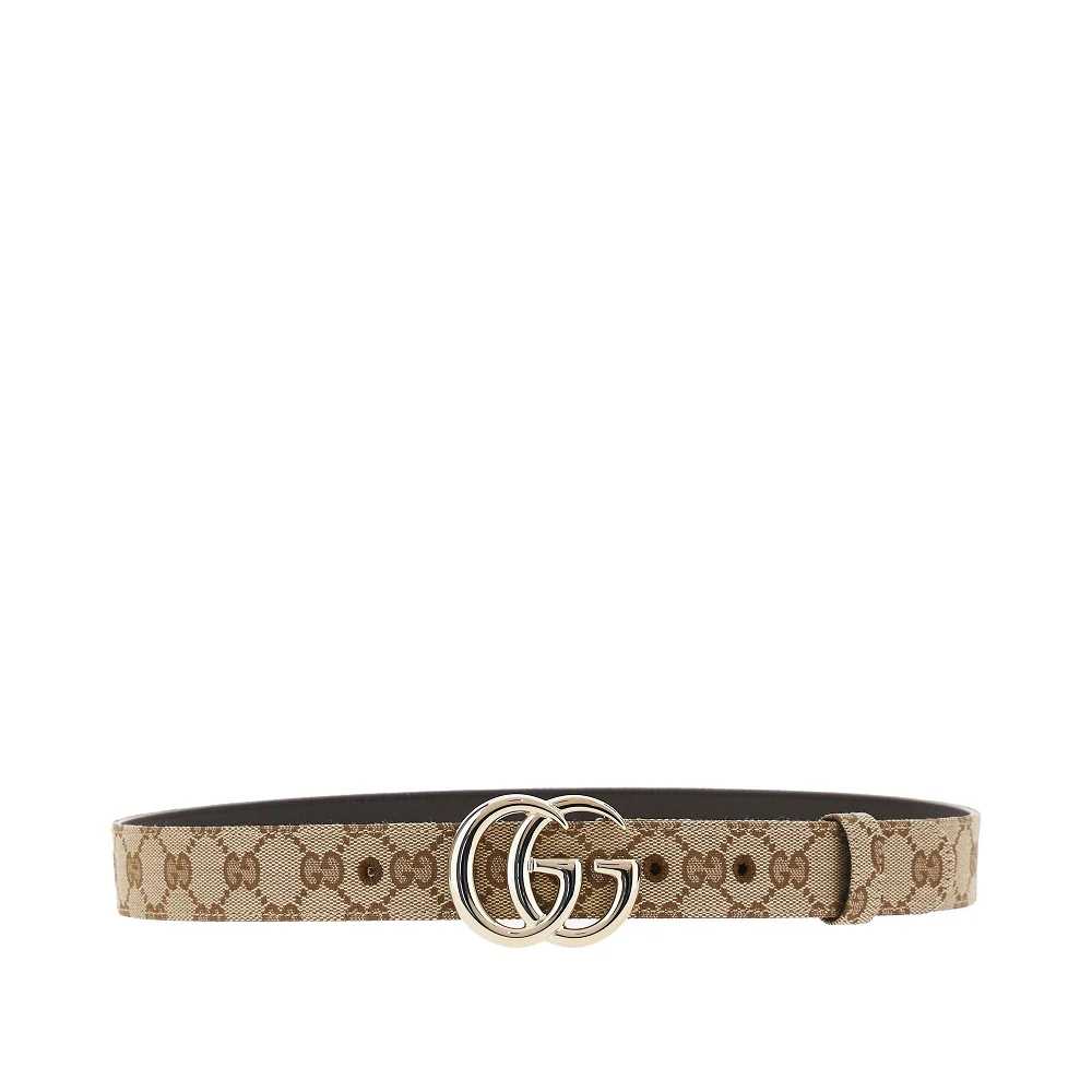 Cintura realizzata nell'iconico tessuto Original GG, arricchita dalla fibbia a perno Doppia G in metallo finitura oro chiaro. Occhielli ricamati e lato interno in pelle liscia.