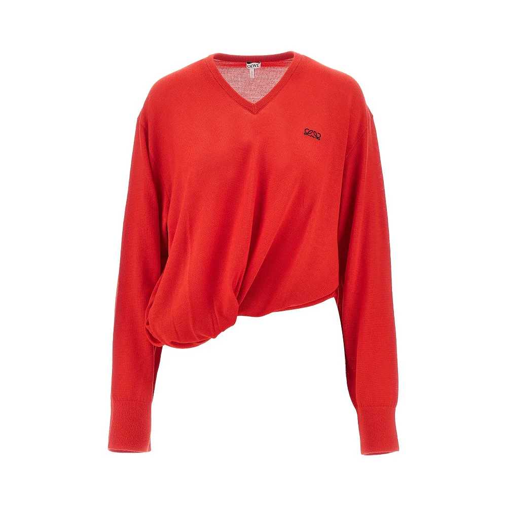 Pullover realizzato in leggero filato di lana, caratterizzato dal drappeggio asimmetrico sul fondo che crea un effetto attorcigliato. Logo "Double L" ricamato sul petto. Scollo a V e polsini rifiniti a costine. Vestibilità rilassata.
