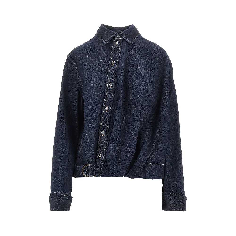 Camicia in denim di cotone Blu Indaco, caratterizzata dal design asimmetrico con drappeggi che creano un effetto ritorto. Cintura sul fondo con anelli a D in metallo, chiusura obliqua con bottoni in madreperla, colletto a punta e polsini alla francese. Ricamo Anagram sul retro. Relaxed fit.