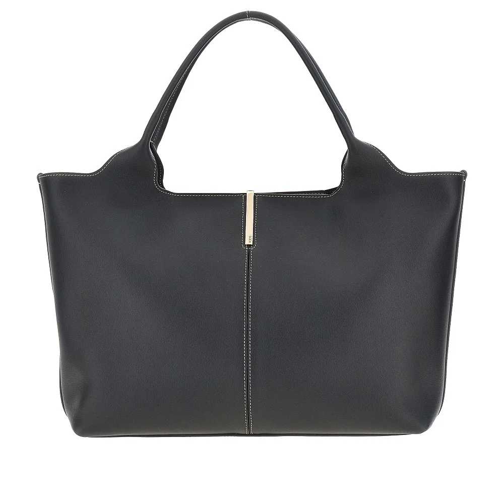 Shopping bag realizzata in pelle con cuciture a contrasto, caratterizzata dalla cucitura centrale arricchita sul davanti dalla barretta in metallo finitura oro con logo inciso. Manici da indossare a mano o a spalla. Chiusura magnetica. Interno scamosciato. Piedini in metallo sul fondo.