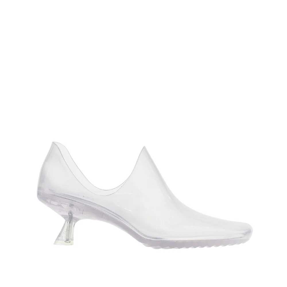 Stivaletti realizzati in PVC trasparente, caratterizzati dalla costruzione monoblocco modellata con punta allungata smussata e tacco obliquo. Accessoriati di un set di tre paia di calzini in jersey tecnico elasticizzato in tre colori differenti: rosso, arancione e blu. Soletta in pelle imbottita.