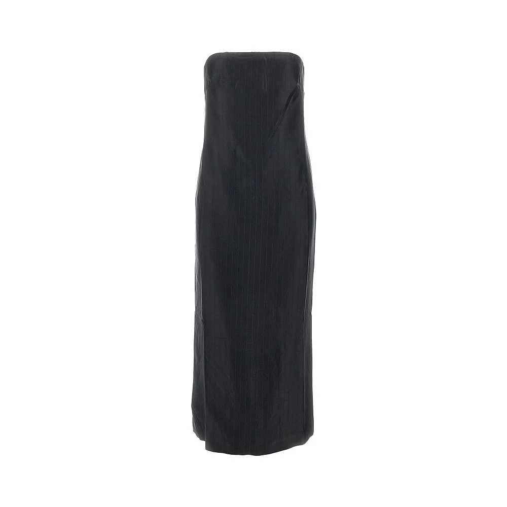 Abito midi senza spalline realizzato in leggero e fluido satin di misto viscosa e seta con motivo gessato, caratterizzato dalla silhouette minimale con spacco centrale sul retro. Bustier interno in mesh con stecche laterali semirigide. Chiusura con zip a scomparsa sul retro. Fodera in cotone.