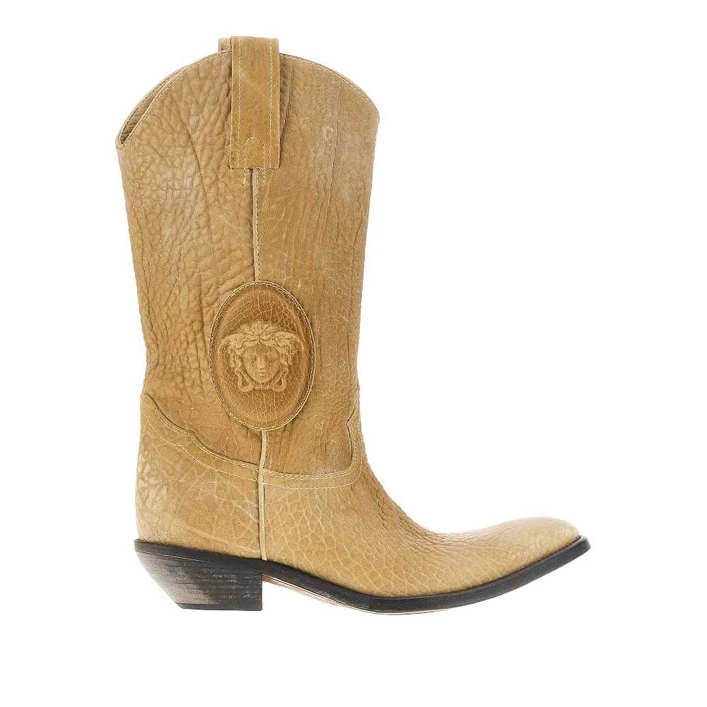Stivali texani realizzati in pelle granata effetto squamato e invecchiato, arricchiti dal patch laterale Medusa Cameo in pelle. Fodera in pelle scamosciata e soletta in pelle. Tacco arrotondato e suola in cuoio con intarsio in gomma.