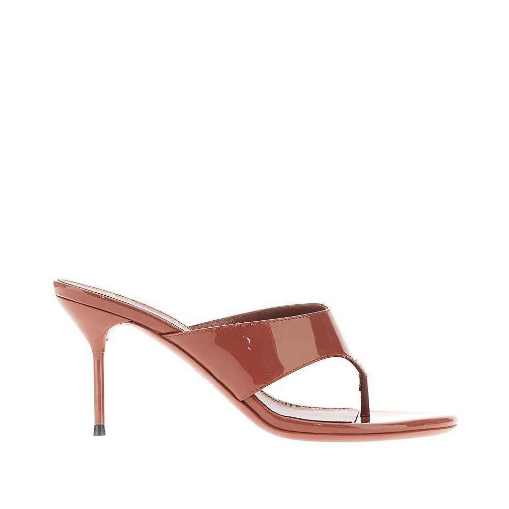 Mules infradito realizzate in pelle verniciata. Fodera e soletta in pelle. Tacco a spillo rivestito e suola in cuoio.