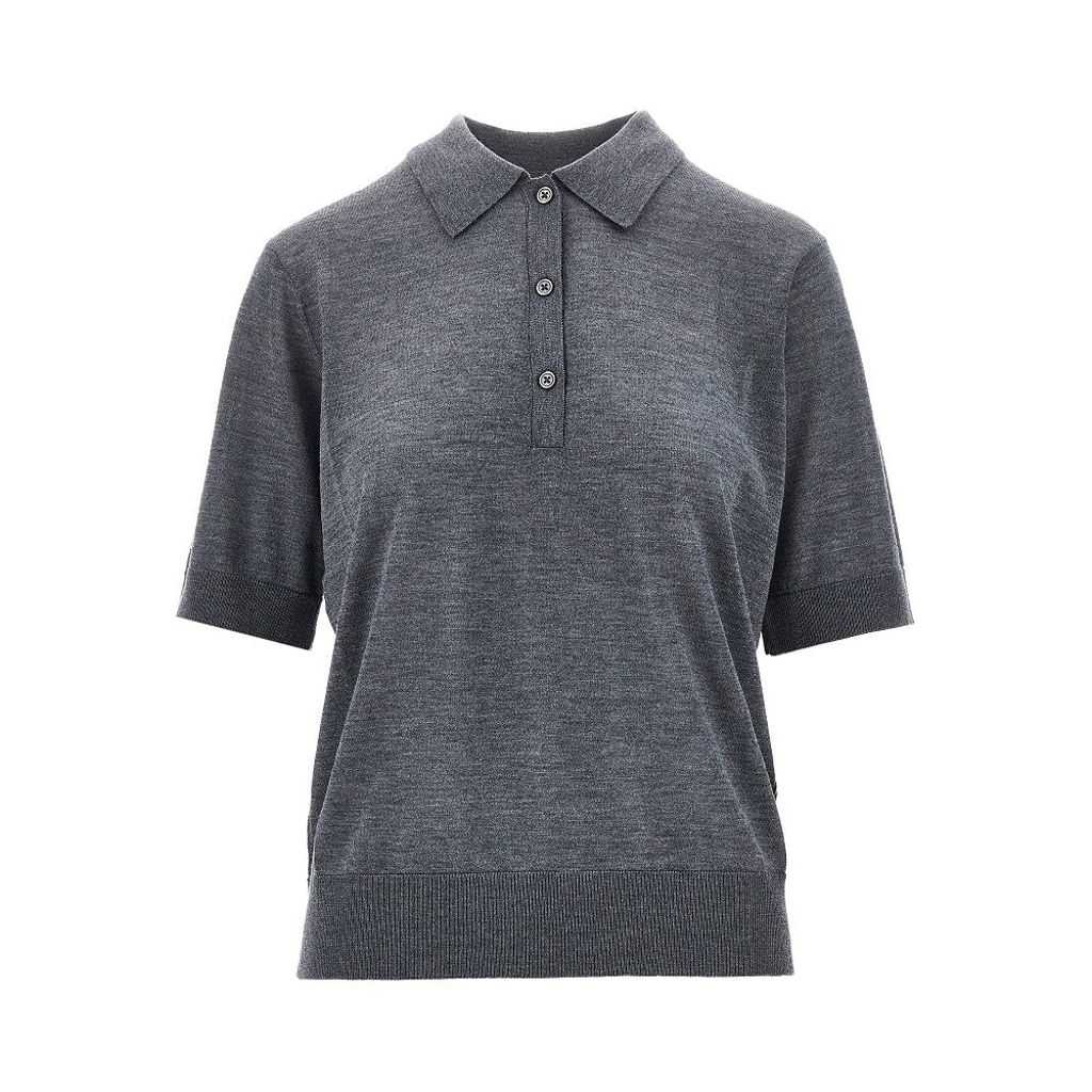 Polo a manica corta realizzata in leggera e morbida maglia di puro cachemire. Colletto, polsini e fondo capo rifiniti in micro costine. Chiusura con tre bottoni. Silhouette dritta e regolare d'ispirazione maschile.