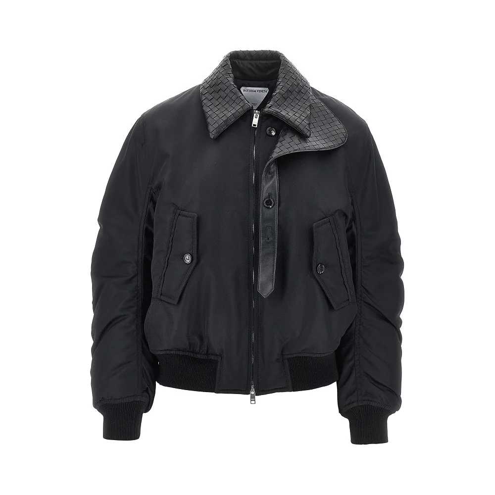 Bomber in nylon imbottito effetto satin con colletto a punta e dal cinturino removibile in pelle Intrecciato. Chiusura con zip a doppio cursore, tasche a filetto con pattina button-down, fondo capo e polsini in maglia elasticizzata rifinita in micro costine. Vestibilità rilassata con spalla scesa.