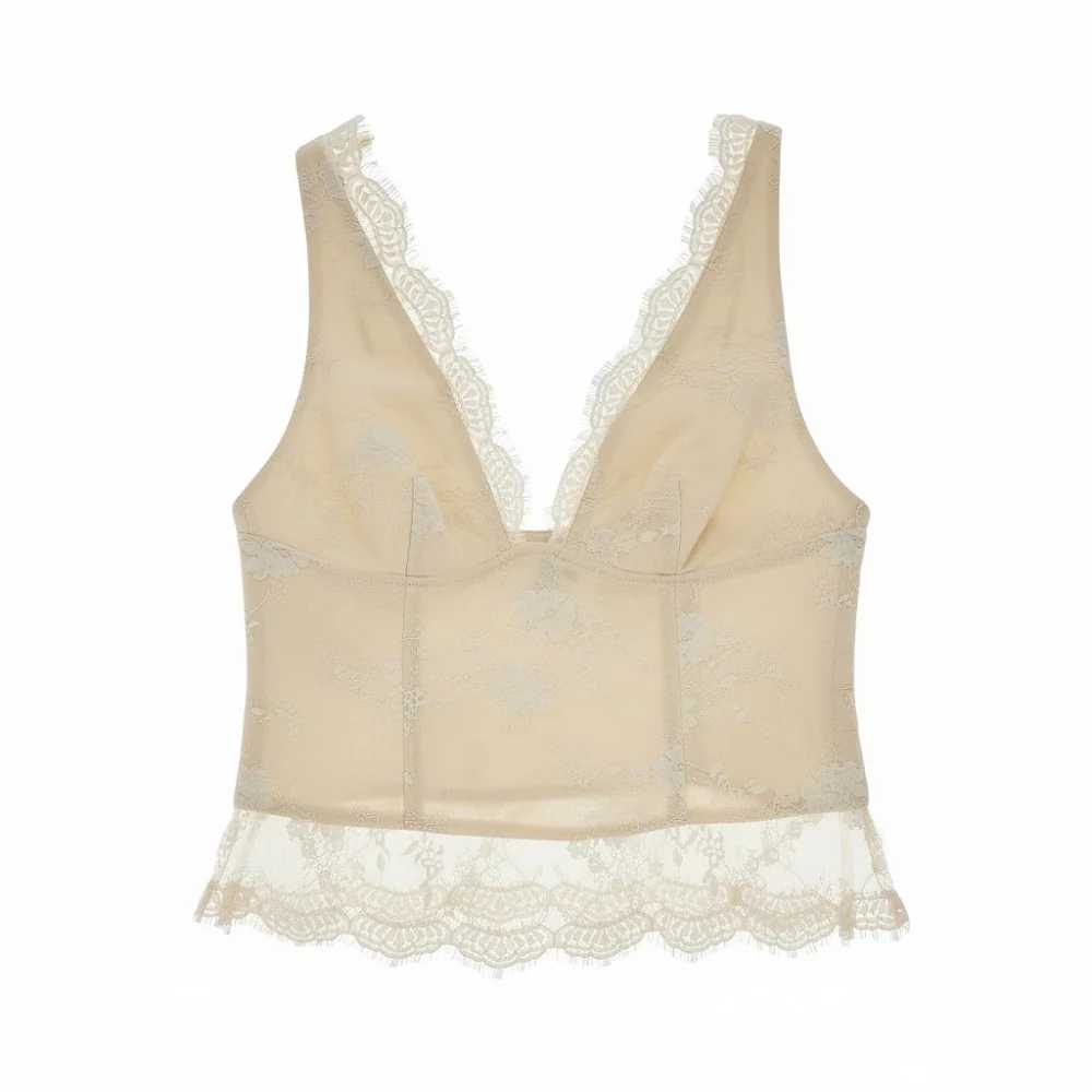 Top senza maniche realizzato in tessuto di puro lino accoppiato a pizzo chantilly di misto cotone. Finiture in pizzo trasparente con bordo smerlato. Profondo scollo a V. Spalline regolabili. Chiusura laterale con gancetti a scomparsa. Vestibilità aderente.