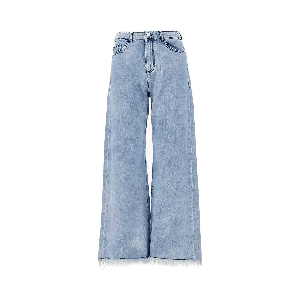 Pantalone cinque tasche in denim di cotone effetto vintage con orlo sfrangiato, caratterizzato da gamba ampia cropped alla caviglia. Vita media con passanti per cintura, patta con zip e chiusura con bottone. Salpa logo in pelle e dettaglio Eagle in metallo sul retro. Vestibilità regolare.